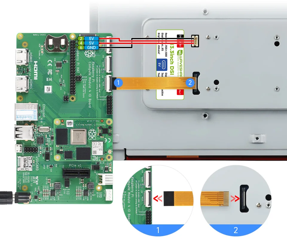 Veuillez connecter le câble DSI comme indiqué ci-dessus et alimenter l’écran LCD via la broche GPIO 5 V.
