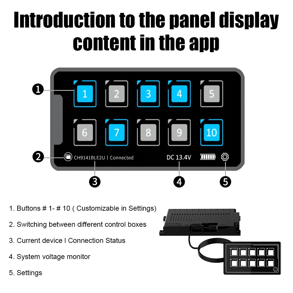 Bouton momentané programmable-tous les boutons sont programmables pour une utilisation instantanée (klaxon idéal ou application d’essuie-glace), y compris un ensemble de divers autocollants d’étiquettes graphiques.