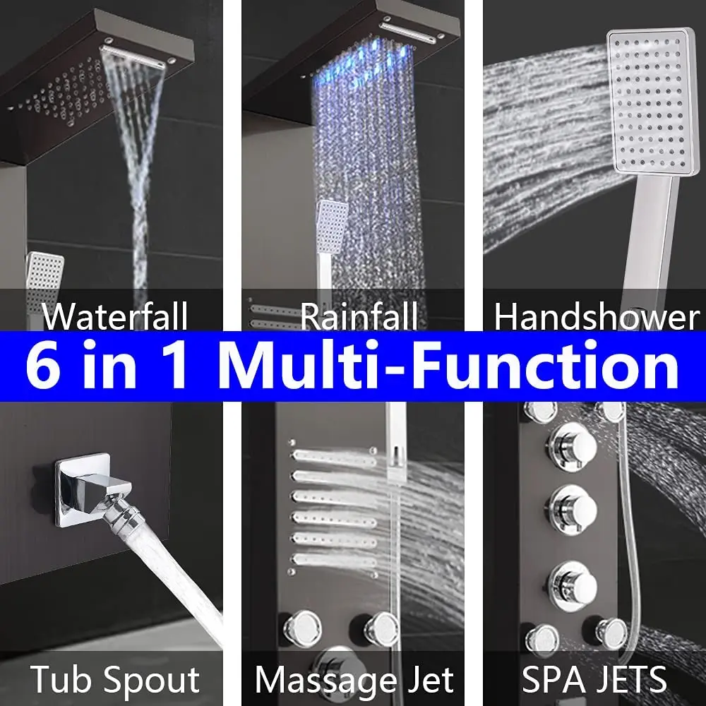 Panneau de douche multifonction 6 en 1: ce système de douche 6 en 1 a une pluie, une chute d’eau, un jet de massage et des jets de sève, une douchette à main et un bec de baignoire, offrant une expérience de douche inoubliable pour se détendre et se sentir bien. Toutes les fonctions fonctionnent indépendamment pour assurer une pression d’eau appropriée.