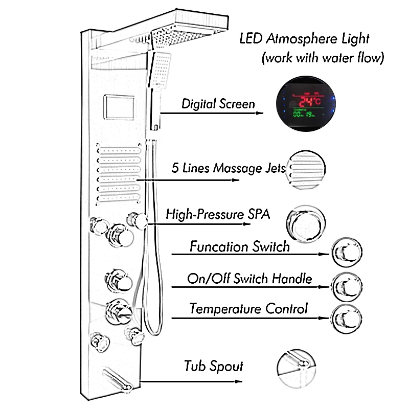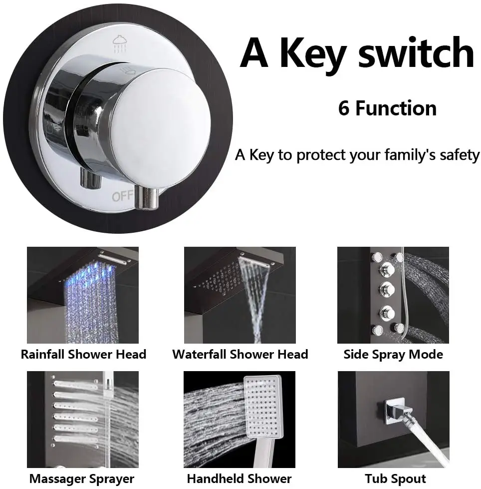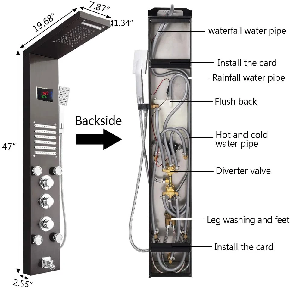 100% plus solide et plus durable: le panneau de douche est fabriqué en acier inoxydable 304 solide et très durable. Matériau environnemental; Antirouille et résistant aux hautes températures pour la durabilité. Longue durée de vie. Sûr à utiliser.