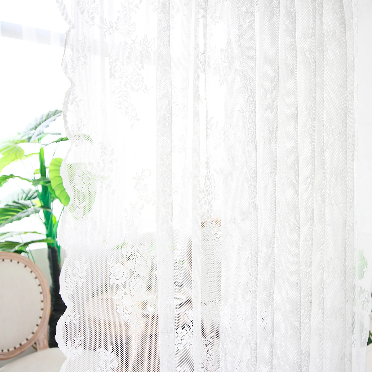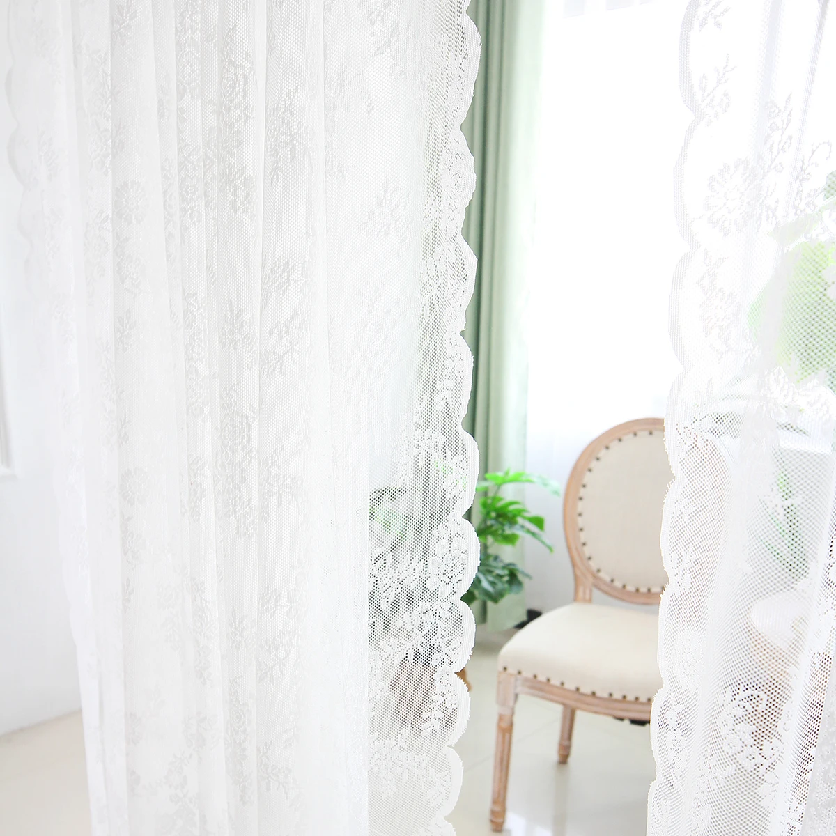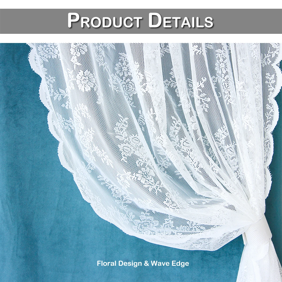 1.Blanc ; Dentelle ; Transparent ; Floral ; Bordure ondulée ; Embrasses gratuites (assemblant le rideau ;