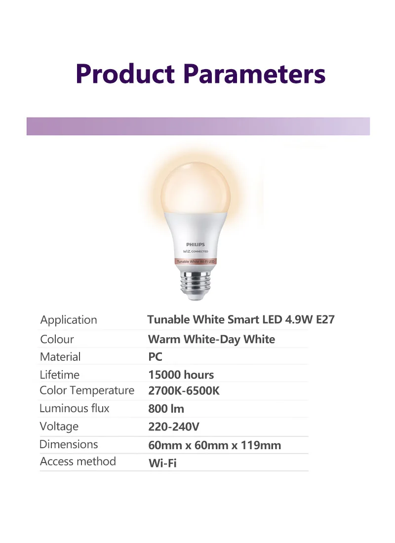 Philips – ampoule intelligente LED Wi-Fi blanche réglable, 9W E27, 220-240V, contrôle par application WiZ, couleur blanche chaude et froide, lampe à intensité variable