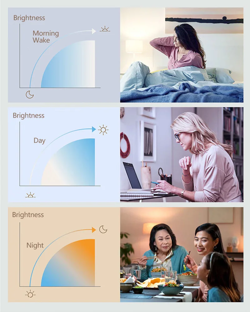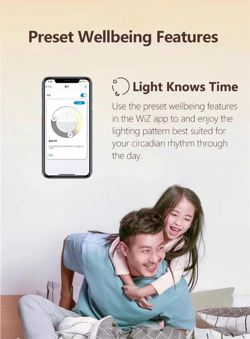 Utilisez les caractéristiques de wellbeing prédéfinies dans l’application WiZ pour profiter du motif d’éclairage, les mieux adaptées au rythme circadien au quotidien. WiZ vous fourniront une lumière du jour lumineuse lorsque vous devez obtenir énergisé et se concentrer et transition en douceur pour un blanc chaud pour aider vous détendre et dormir mieux.