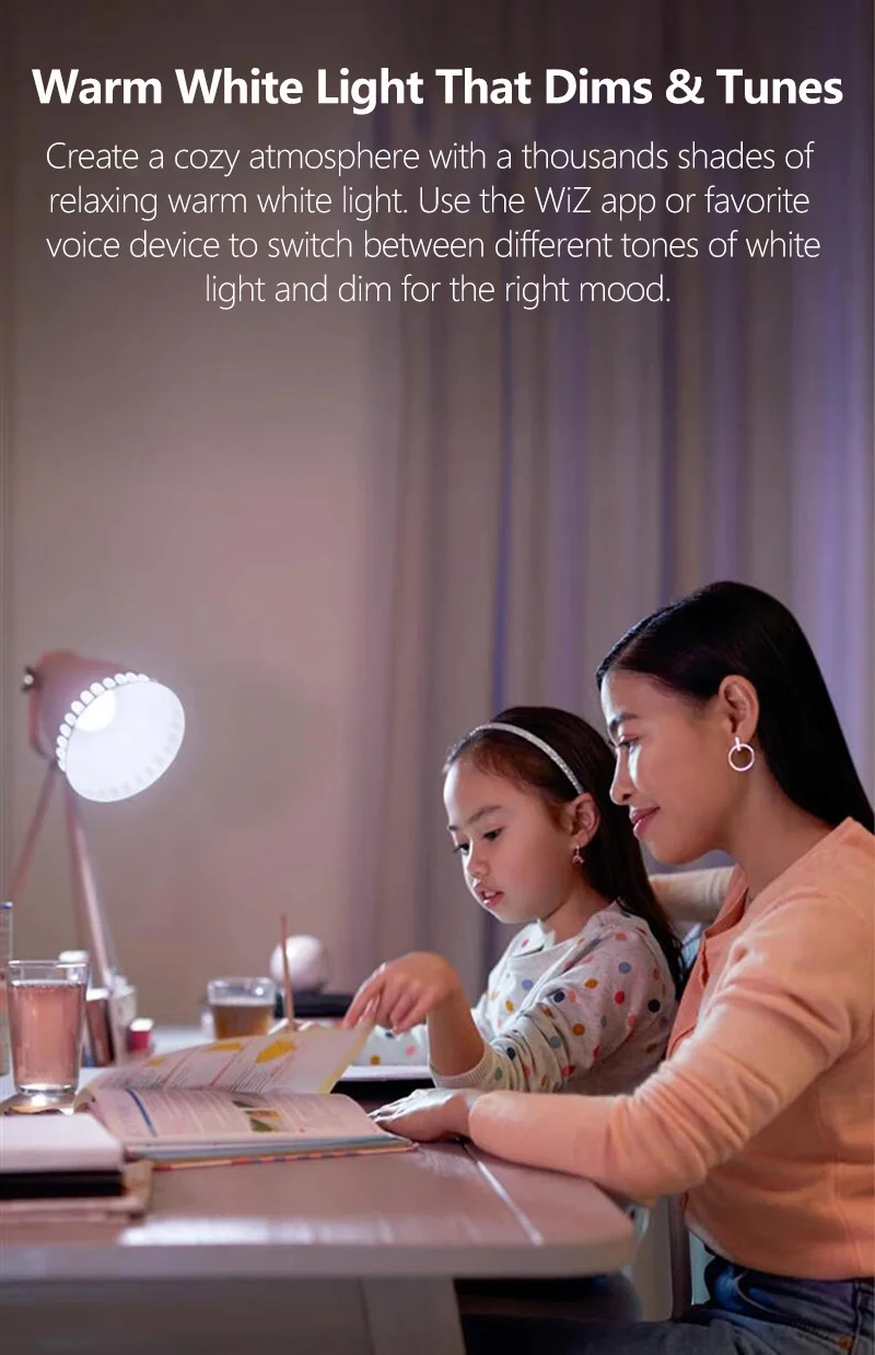 Mélangez différentes modes de couleurs et de lumières blanches pour créer l’ambiance lumineuse parfaite pour votre moment quotidien.Enregistrez-le et appelez-le à tout moment avec l’application, WiZmote ou la voix.