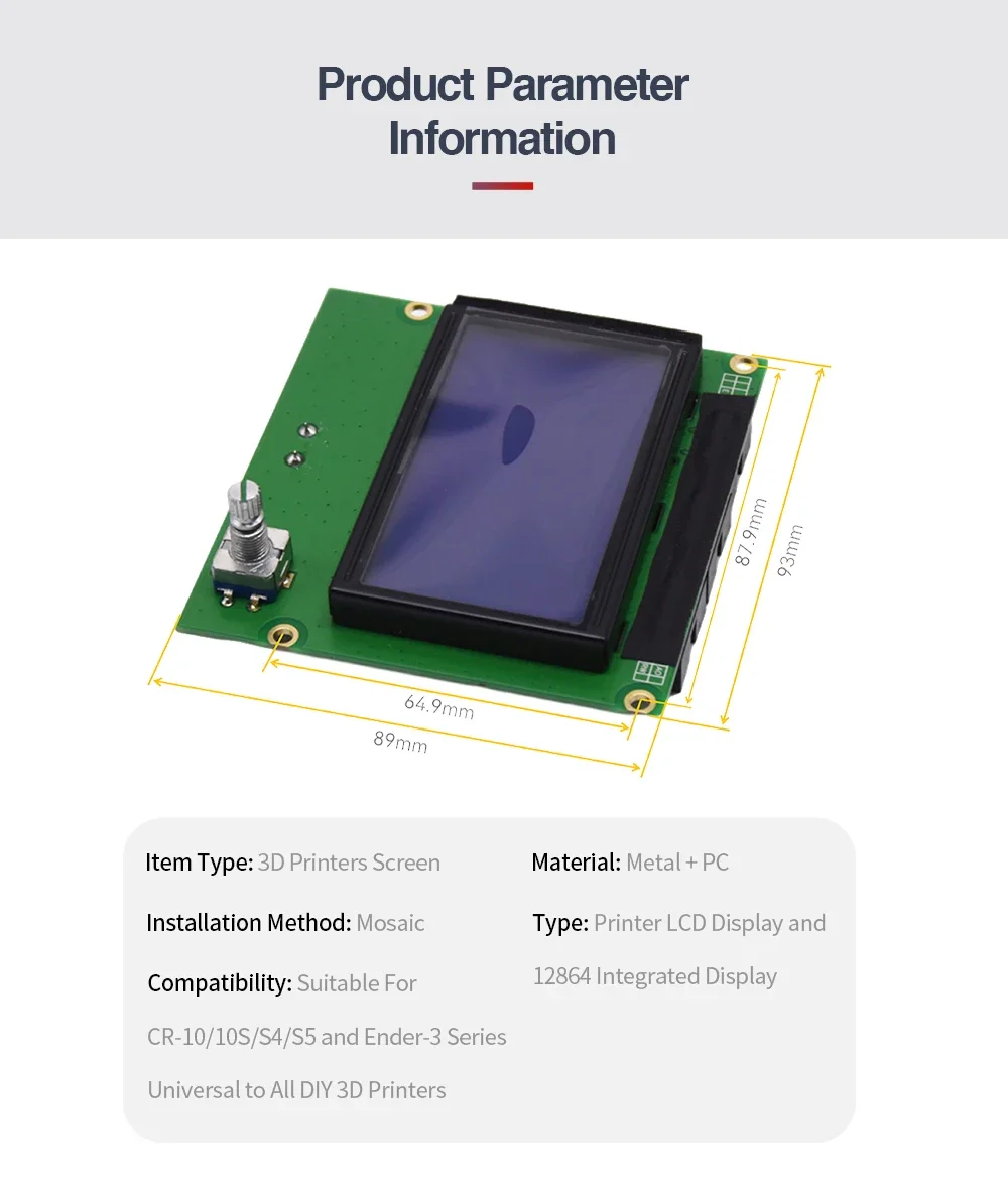 Le écran d’imprimantes 3D EksThis est l’écran LCD d’origine pour les séries CR-10/S3/S4/S5/Ender-3. Ex★Le écran d’imprimante 3D est fabriqué en métal de qualité et en matériau PC, qui est inodore et non toxique. 3、 Essaire écran LCD peut réparer l’écran de l’imprimante 3D série CR-10/Ender-3, donnant de plus commodité. 4、 Installation simple, peut terminer rapidement l’installation du nouvel écran, avec écran LCD, câble ruban, bouton. 5、 Veuillez payer l’attention au positif et négatif de la ligne électrique et toutes les ports de connexion avant de mise sous tension. Éviter endommager l’écran LCD. Type d’article de spécifications : matériau d’écran pour imprimantes 3D : métal + PC Compatibilité : Convient aux séries CR-10/10S/S4/S5 et Ender-3, universel pour toutes les imprimantes 3D DIY. Méthode d’installation : mosaïque
