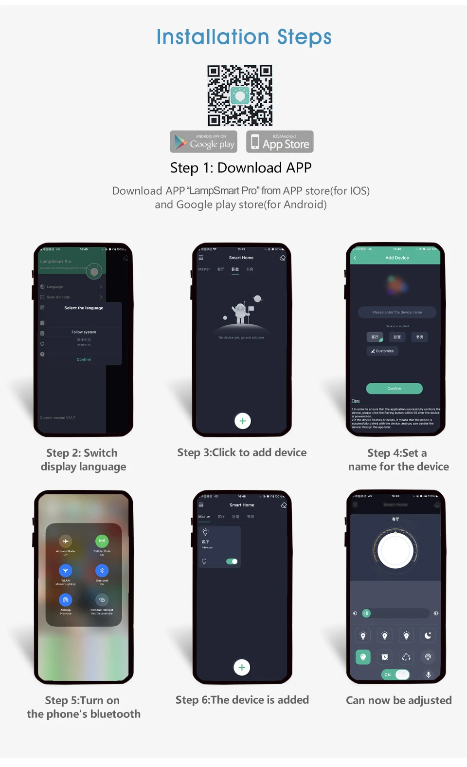 Step 1: Scan the QR code or search for and download the "LampSmart Pro" APP from your mobile app store, register your account and login.