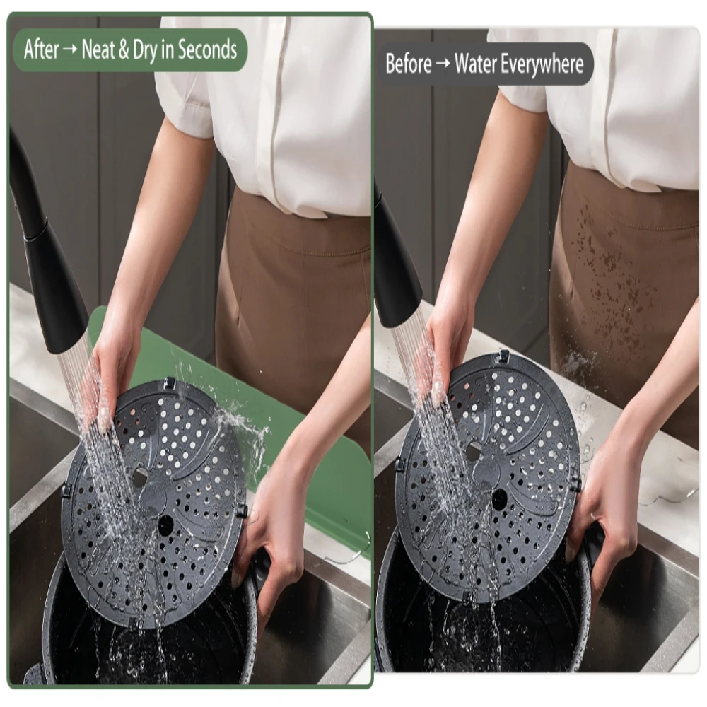La protection ultra large couvre une zone d’évier plus large pour éviter les éclaboussures et garder les vêtements au sec – parfaite pour les grands éviers de cuisine ou les lave-vaisselle actifs.