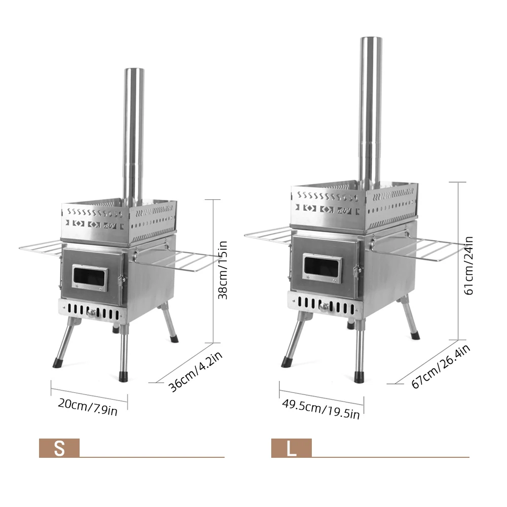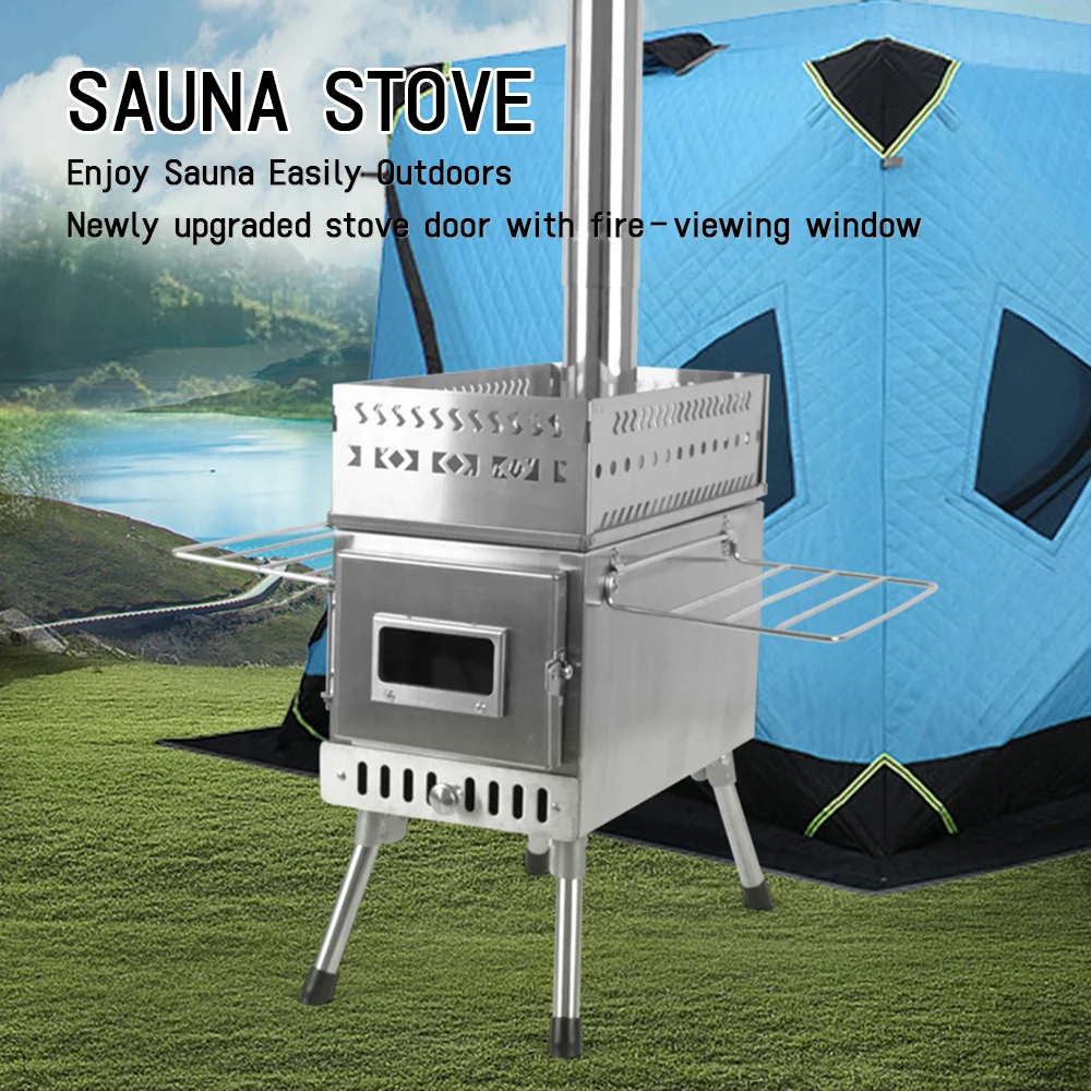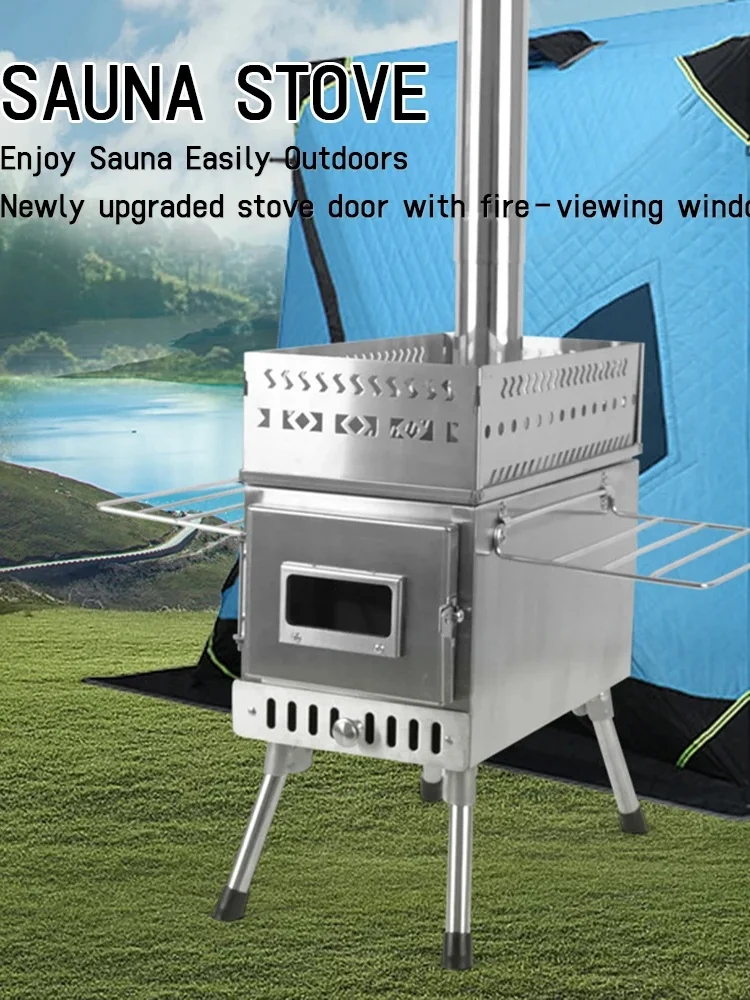 Poêle de sauna en acier inoxydable, adapté aux tentes de camping en plein air, chauffage au bois pour le chauffage, pliable et portable pour un usage domestique, conçu avec une fenêtre, rendant le sauna facilement accessible à l’extérieur.
