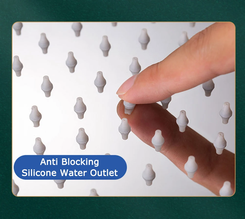 2) Sortie d’eau en silicone, anti-colmatage, facile à nettoyer (si certains trous ne produisent pas d’eau, vous pouvez presser manuellement le trou en silicone et répéter plusieurs fois pour le réglage)