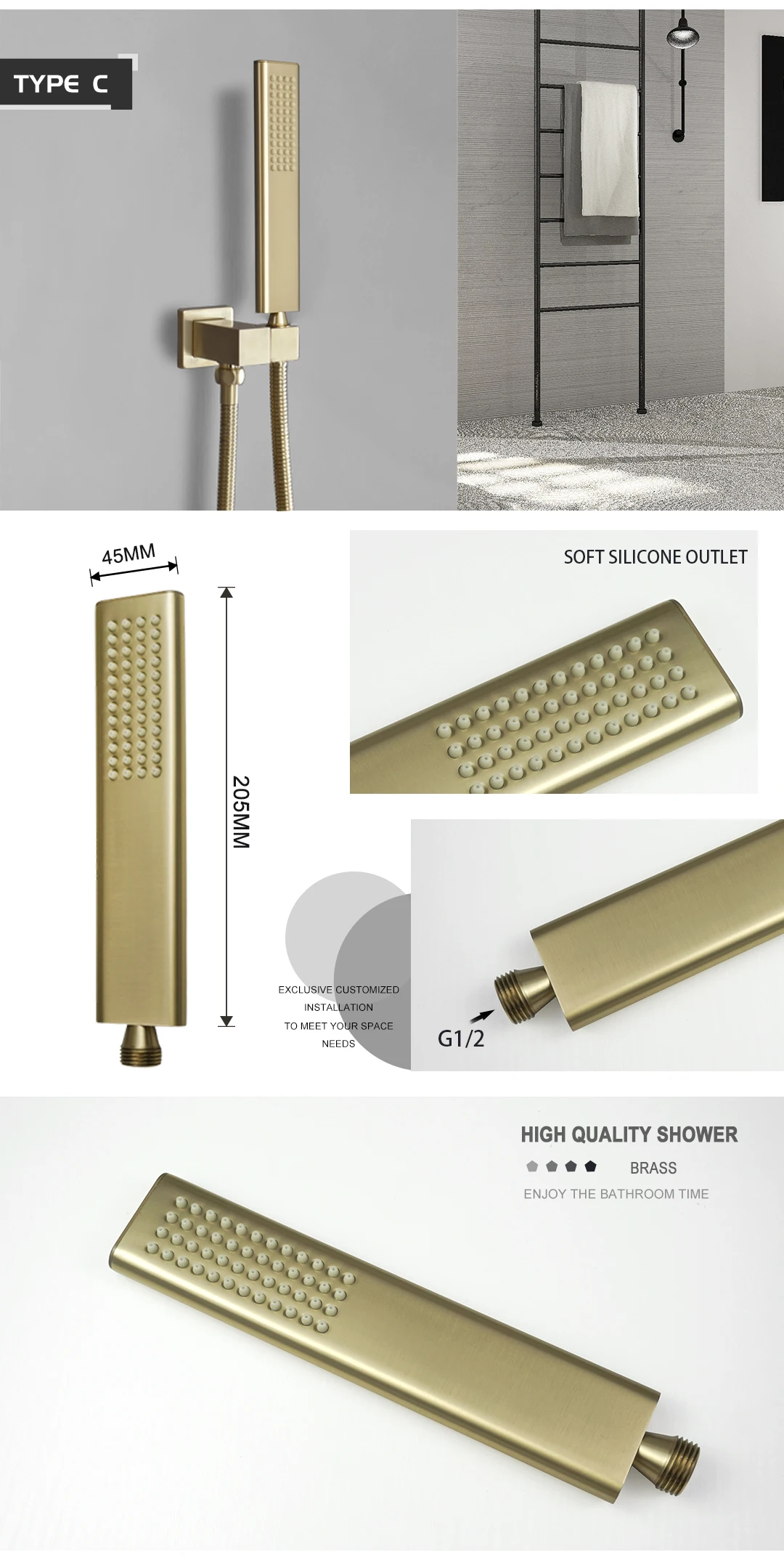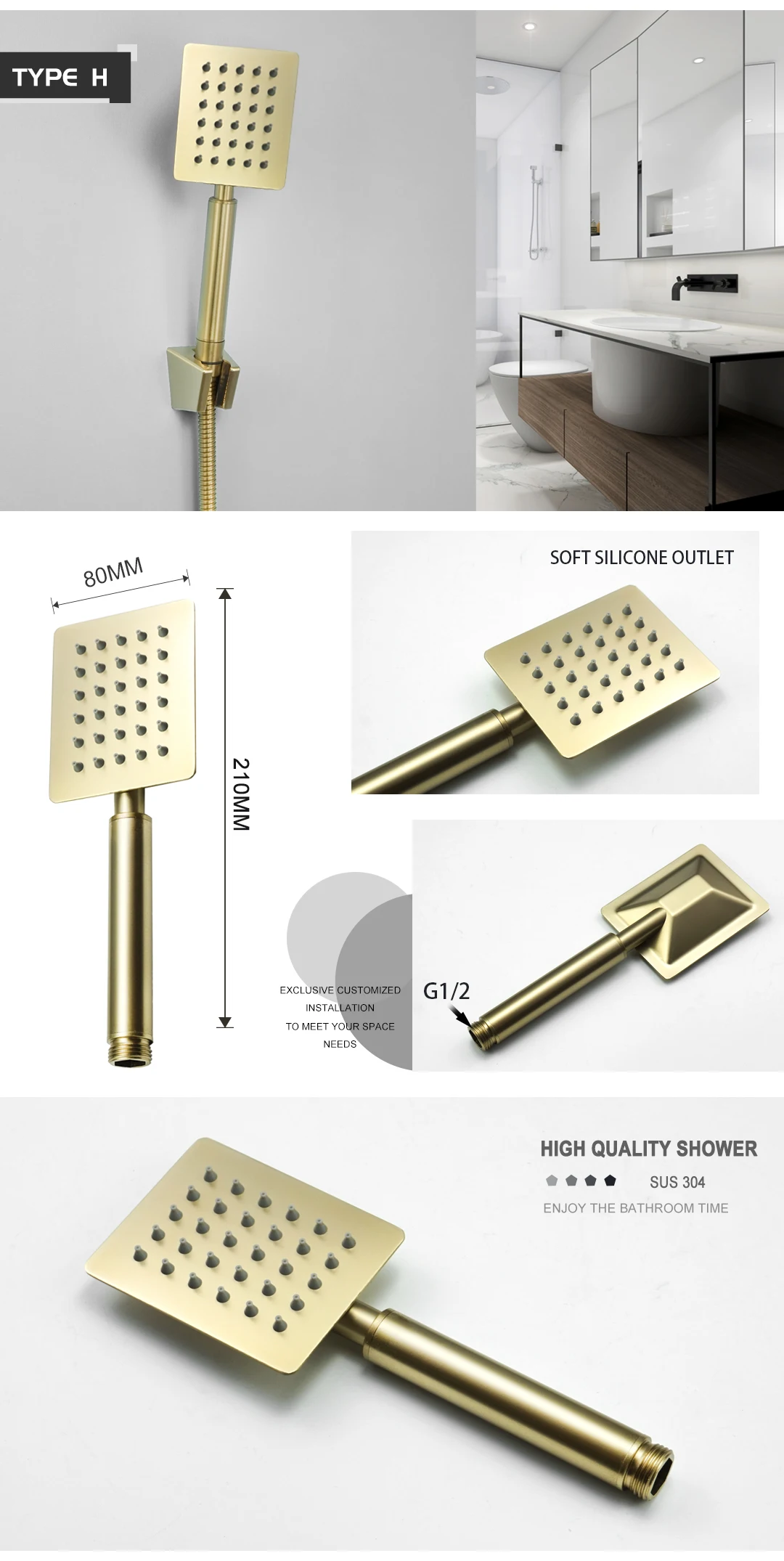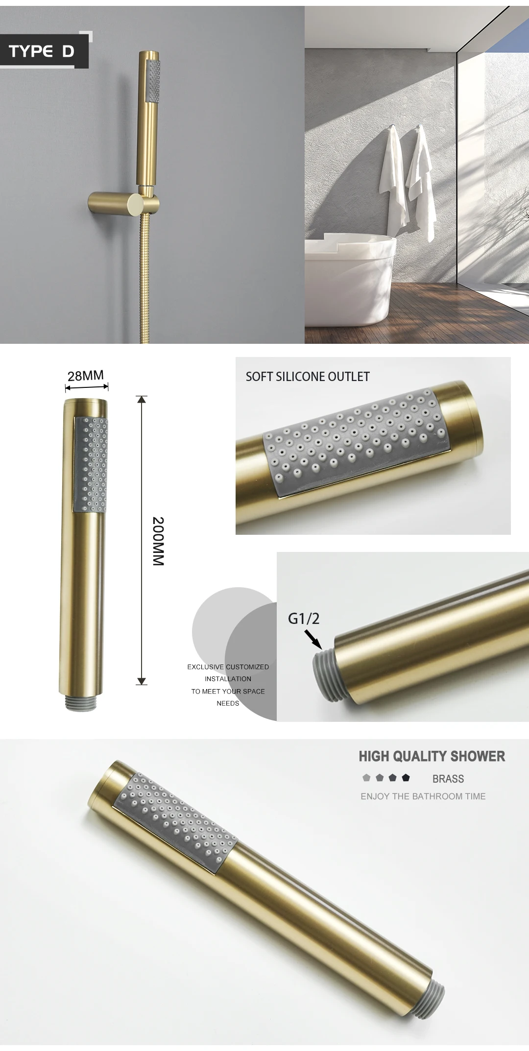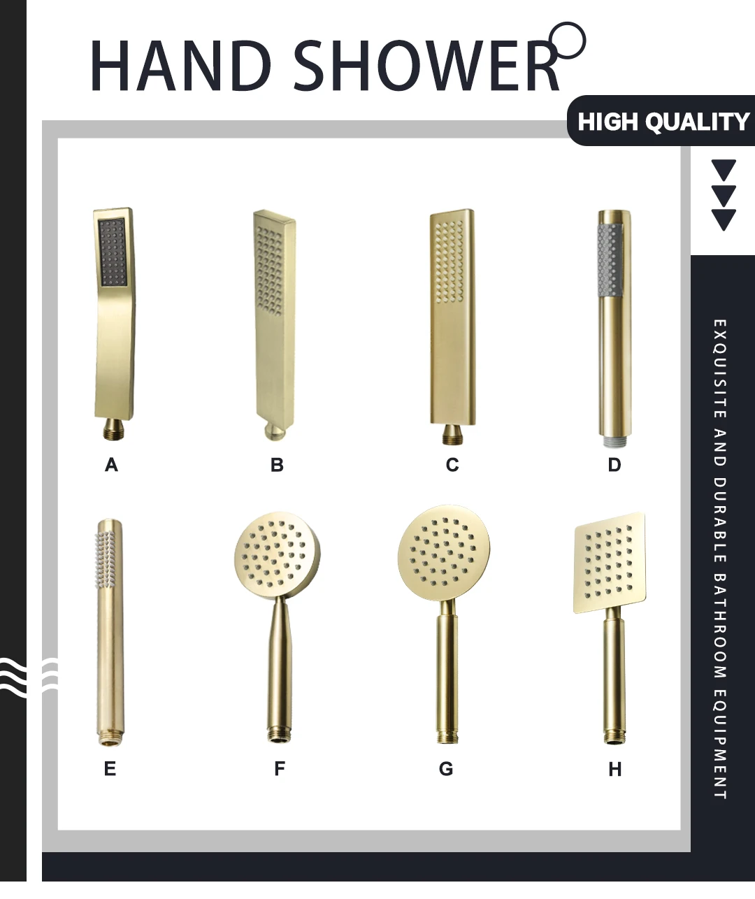 Pommeau de douche à main en or brossé, salle de bains, finition dorée, laiton ou acier inoxydable, douche de pluie, pomme de douche à main