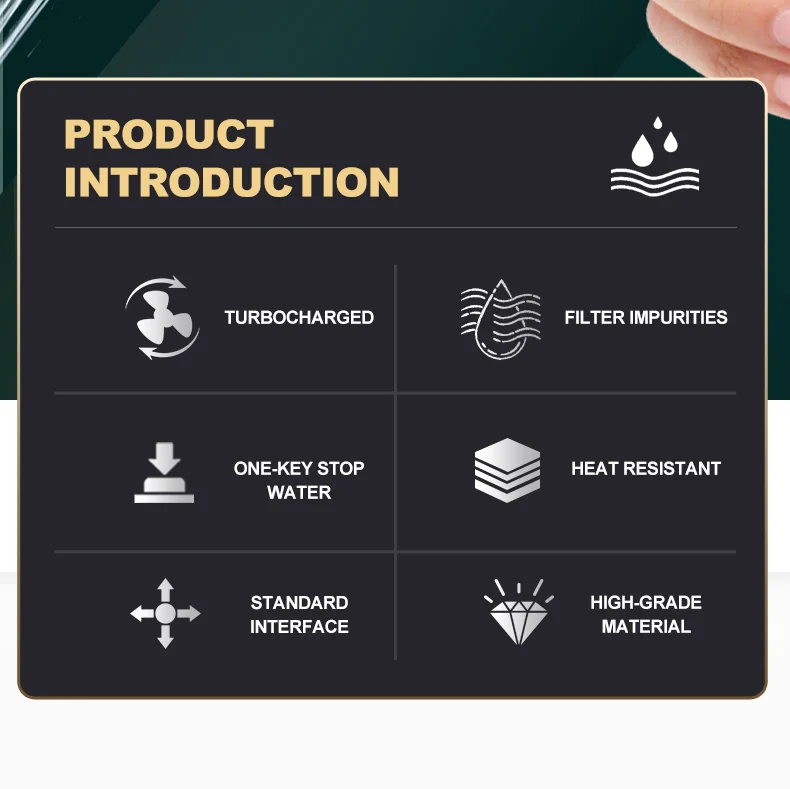 【Ventilateur turbo intégré】 Le débit d’eau sera pulvérisé sur les pales du ventilateur turbo et conduirez le ventilateur turbo pour tourner rapidement.Augmenter la pression de l’eau.
