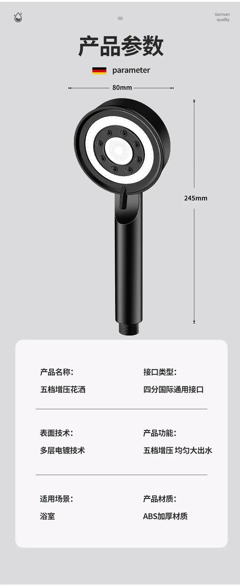 Matériau de la pomme de douche : plastique ABS.