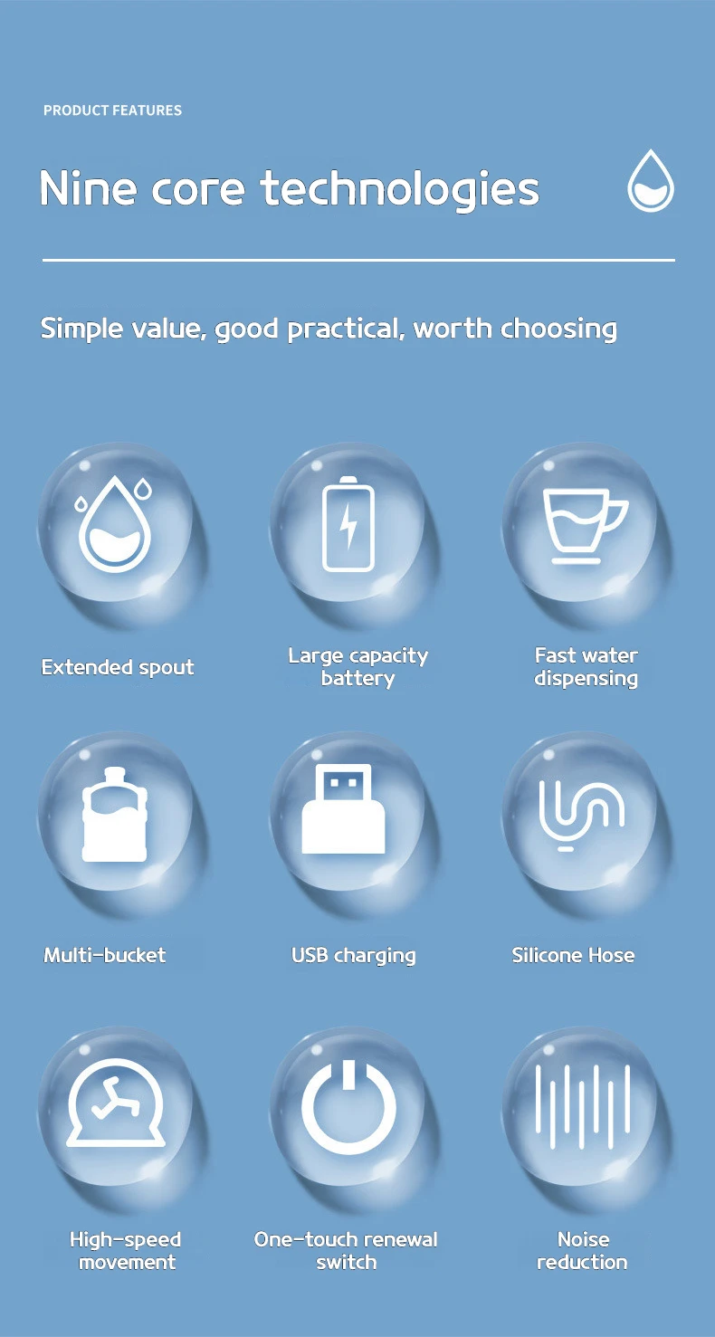 Pompe à eau électrique intelligente avec interrupteur automatique à une touche – Rechargeable par USB pour la distribution d’eau et de minéraux purifiés, usage domestiquePompe à eau électrique intelligente avec interrupteur automatique à une touche – Rechargeable par USB pour la distribution d’eau et de minéraux purifiés, usage domestique