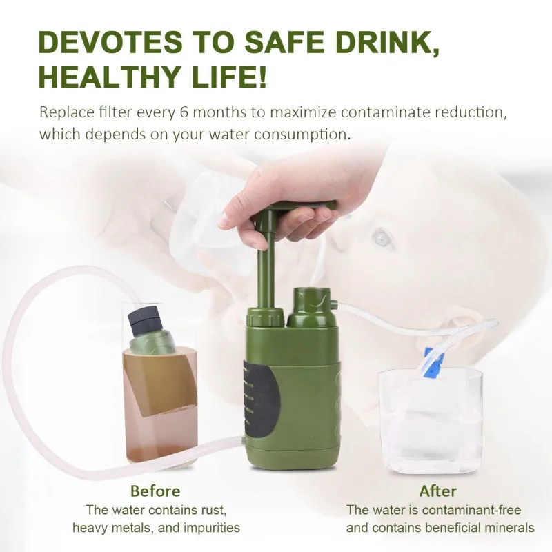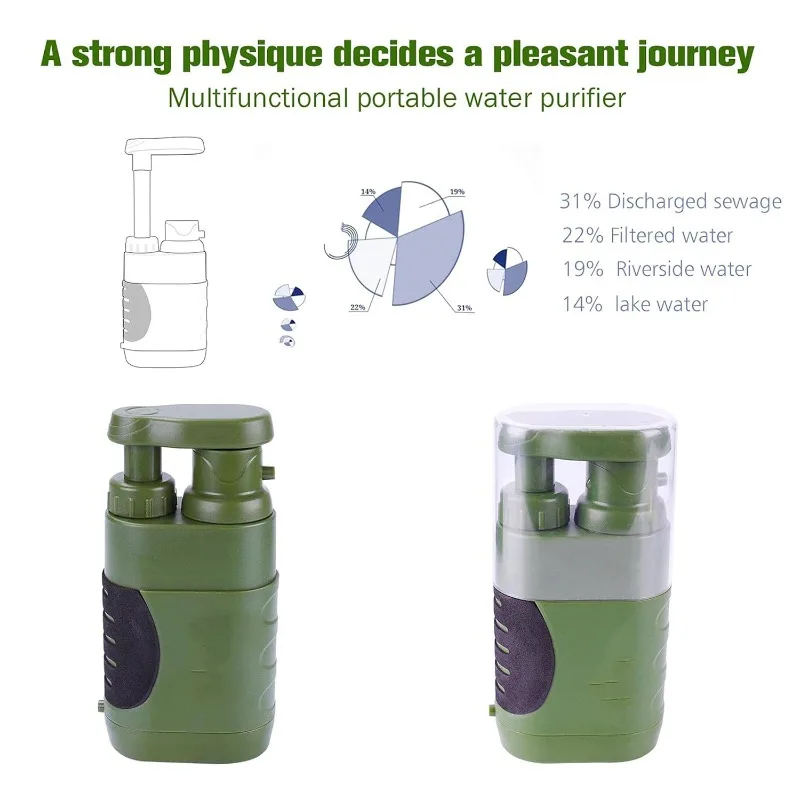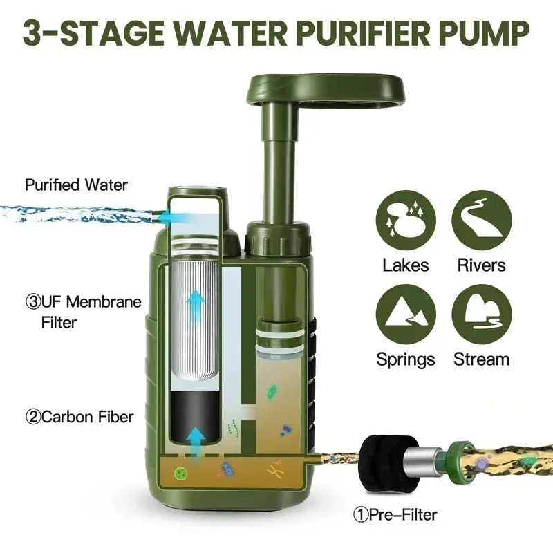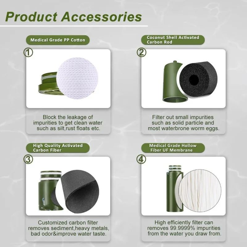 Filtre avancé à 3 niveaux : 0. Le filtre à eau de camping à membrane d’ultrafiltration de 01 microns pourrait aider vous filtrer efficacement l’eau (le diamètre est une dix mille des cheveux), tout plus grand que 0. 01 microns de diamètre ne peut pas passer, filtre à charbon aide à éliminer les odeurs et améliorer le goût.