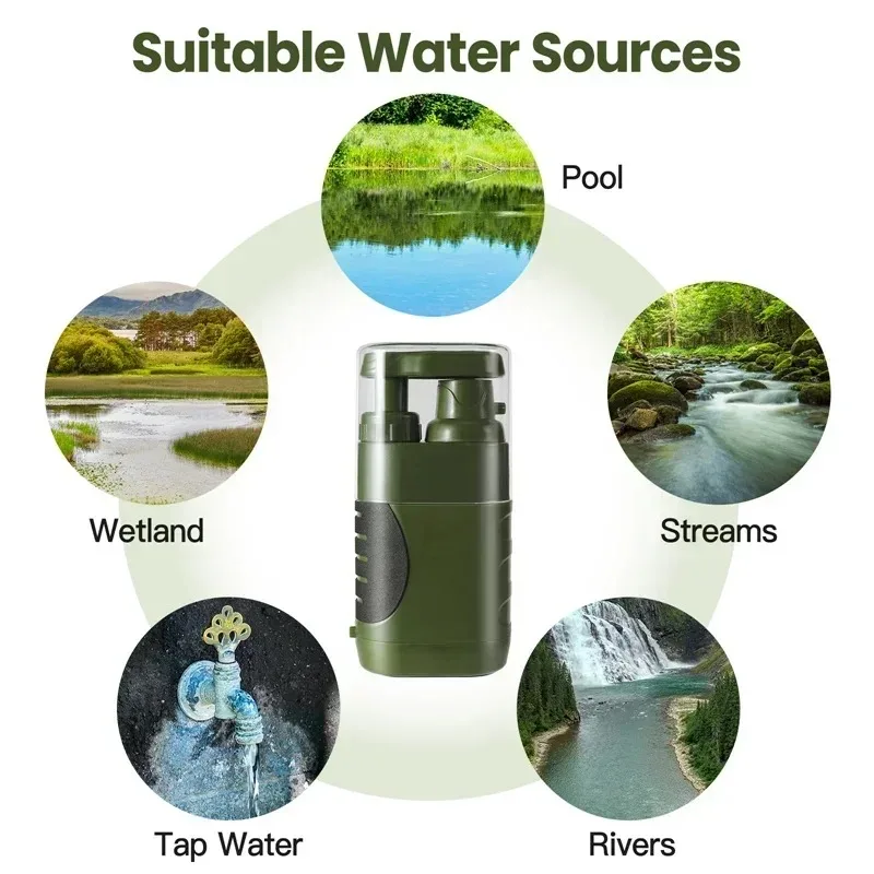Purificateur d’eau de camping :Filtre à eau extérieur pour la randonnée, le camping, adapté à la plupart des sources d’eau extérieures, peut transformer efficacement les lacs, les rivières, les sources, les ruisseaux en eau potable et est parfait pour la randonnée en plein air, le camping, la chasse, la pêche et la préparation aux situations d’urgence.