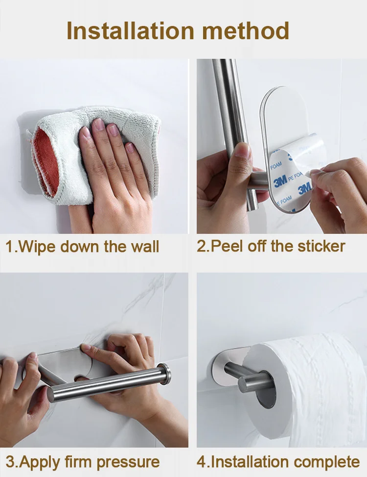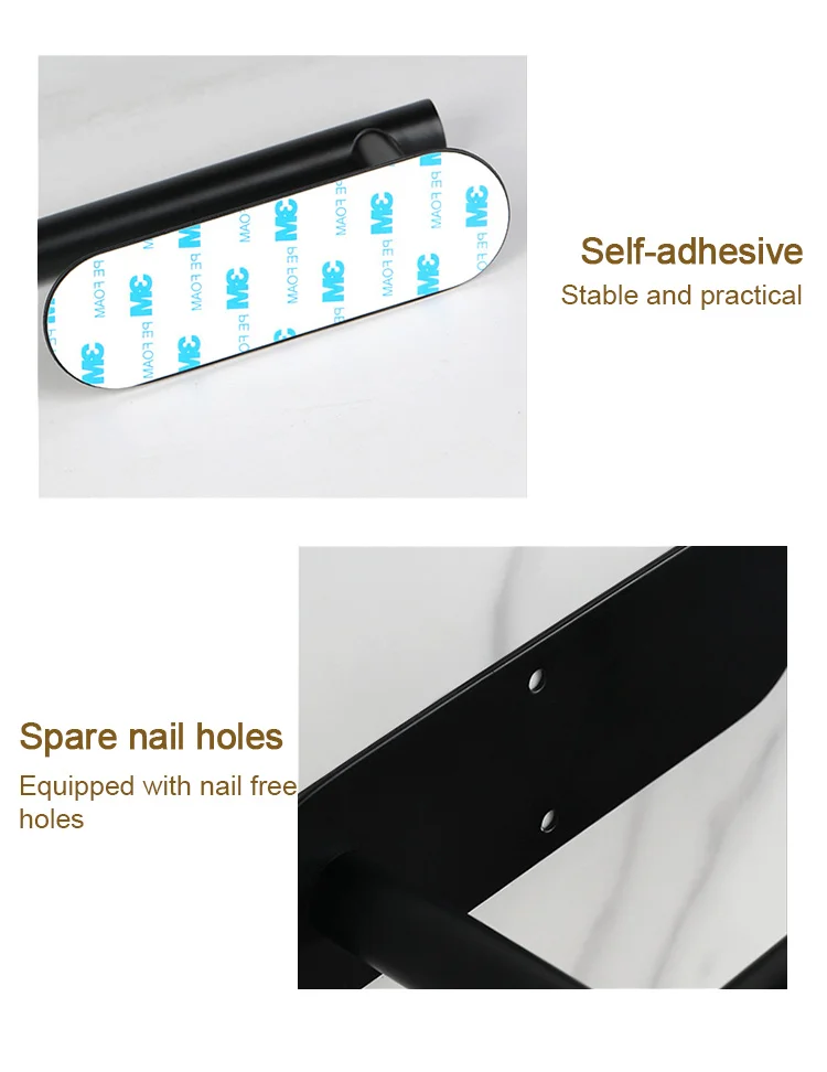 2.Auto-adhésif : Confiance dans l’installation de supports de papier avec tampon adhésif ou perçage. La conception auto-adhésive fonctionne bien sur les surfaces lisses telles que le carrelage, le marbre, le verre, le métal, la surface en plastique et la plaque de laque.sans perçage, robuste et simple à installer.La conception de perçage est particulièrement adaptée aux surfaces inégales telles que les murs blanchis, les murs en ciment rugueux, les murs en briques et le papier peint.