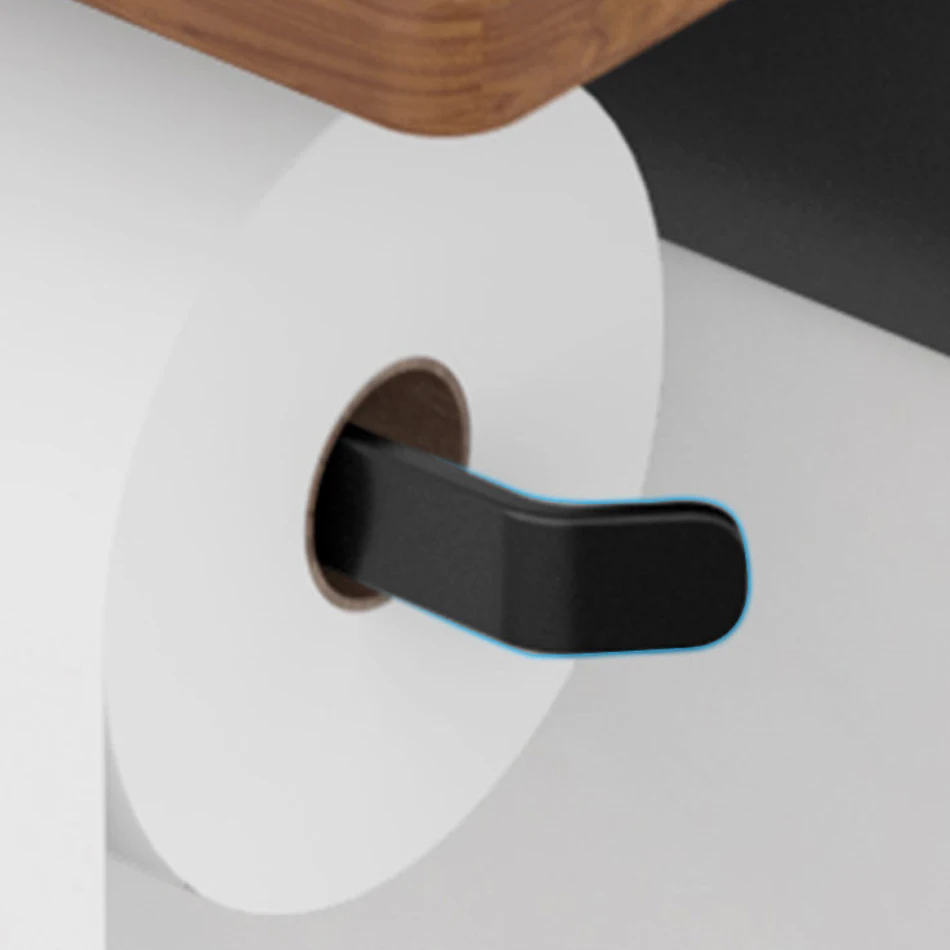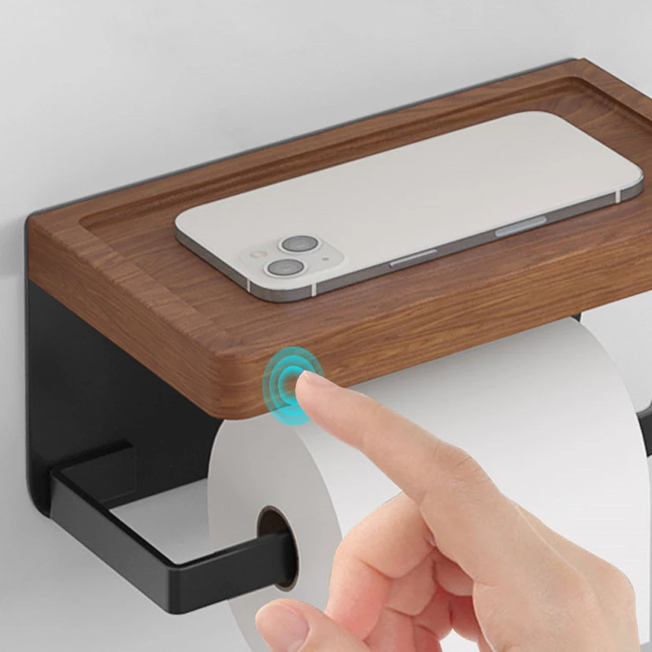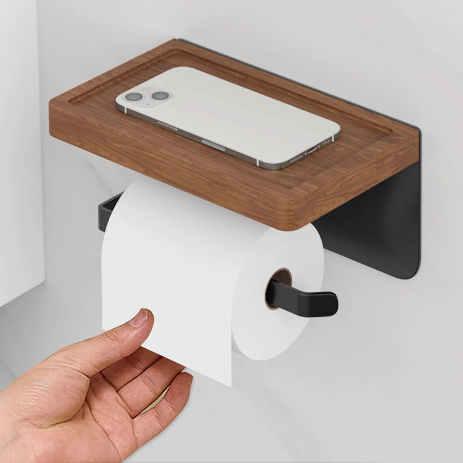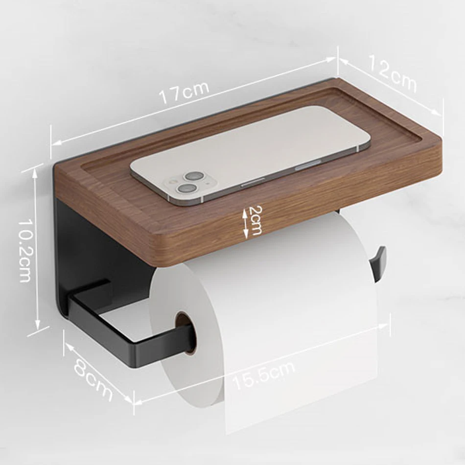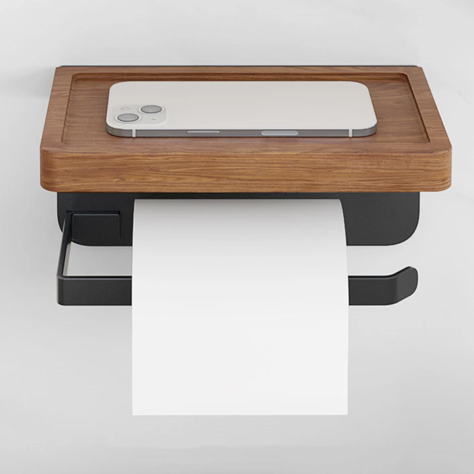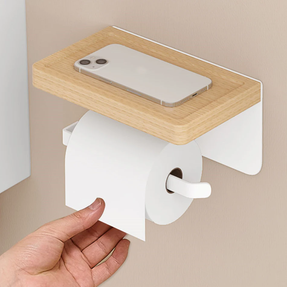 Paper Holder with Shelf White Aluminum Wall Mounted Creative Wood Toilet Paper Roll Rack Storage Tissue Holder for Bathroom WC