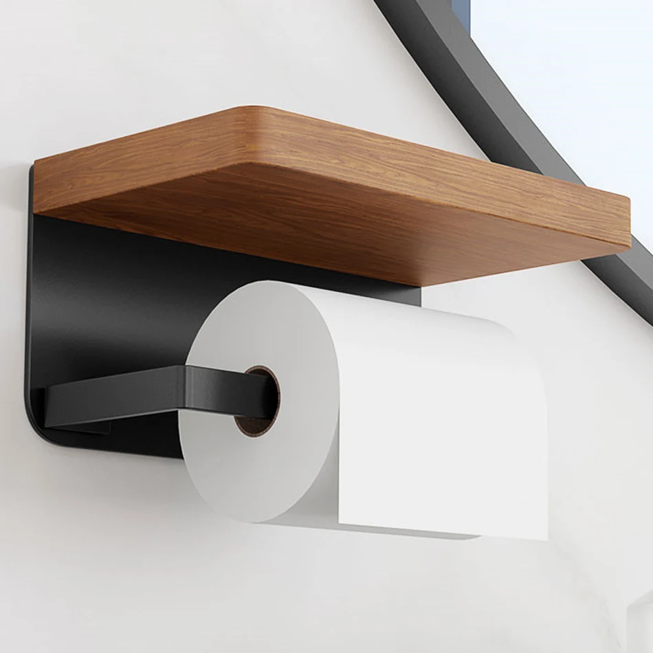 Paper Holder with Shelf White Aluminum Wall Mounted Creative Wood Toilet Paper Roll Rack Storage Tissue Holder for Bathroom WC
