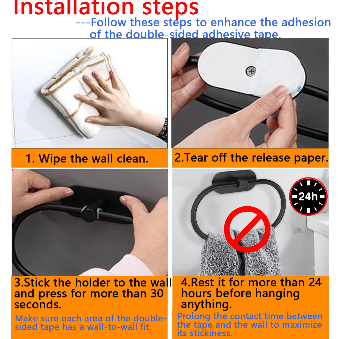 【No Punching】Ce porte-serviettes/anneau est doté d’un ruban adhésif double face résistant, sans perceuse, sans poinçon, sans clous.