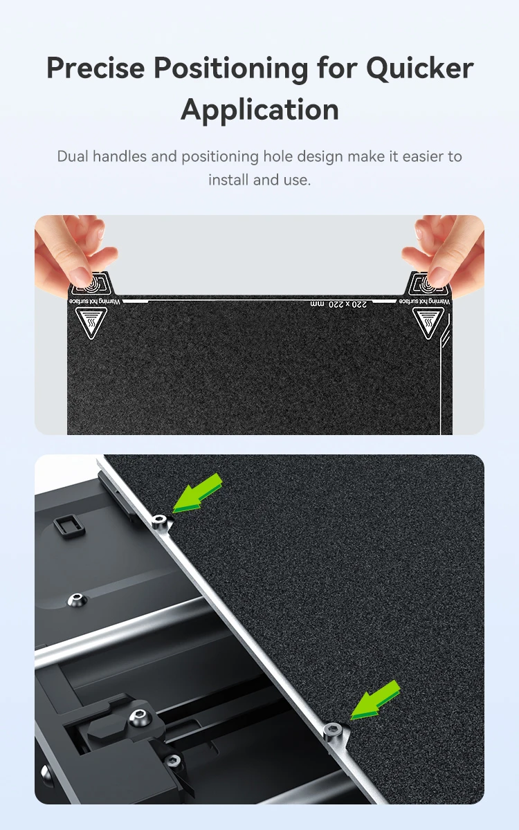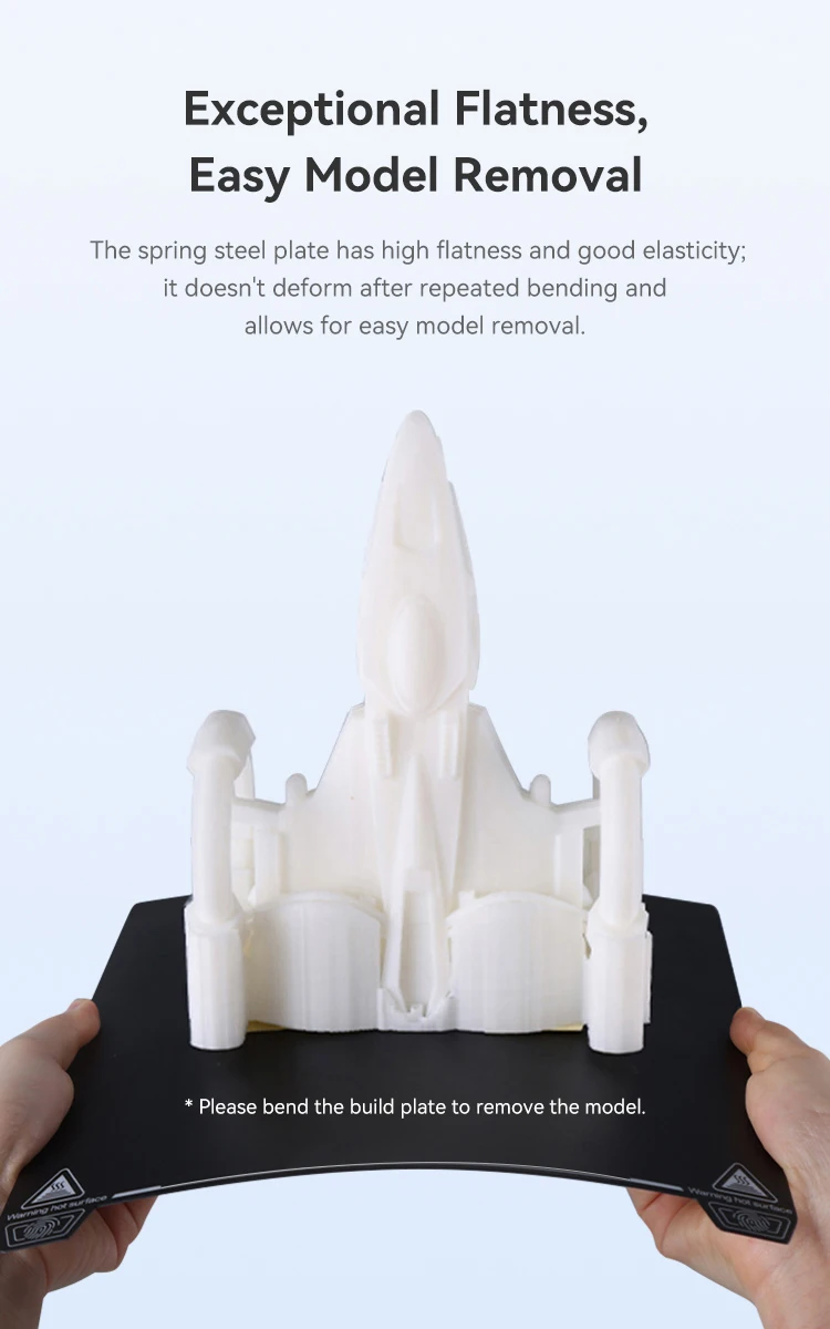 La plaque d’acier à ressort a une grande planéité et une bonne élasticité, elle ne se déforme pas après des flexions répétées et permet un retrait facile du modèle.