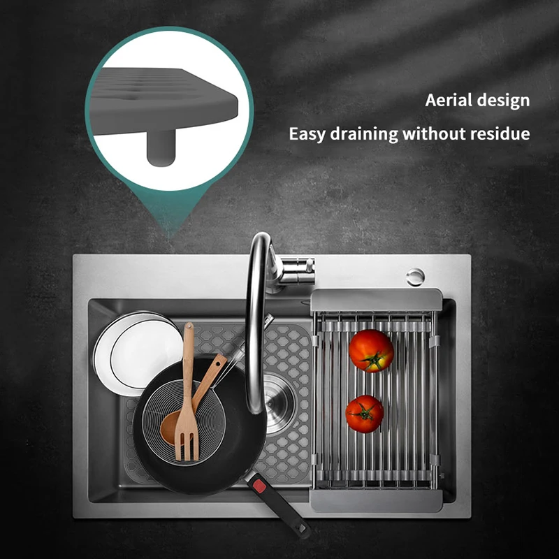 2,Design antidérapant + Drainage intelligent : le matériau en silicone fournit des pieds surélevés une forte adhérence sur le fond de l’évier, antidérapant pour augmenter le flux d’eau et les résidus alimentaires dans le bas, donc le tapis se reste en place qu’il vous utilisez pas. Pas de glissement ou de glisser.