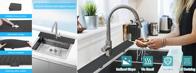 【Nouveau tapis de protection contre les éclaboussures d’évier plus long】 Matériau en silicone de qualité alimentaire, doux et durable.Taille étendue : 29,52″ x 6,02″, diamètre du trou réglable pour s’adapter à la plupart des robinets.