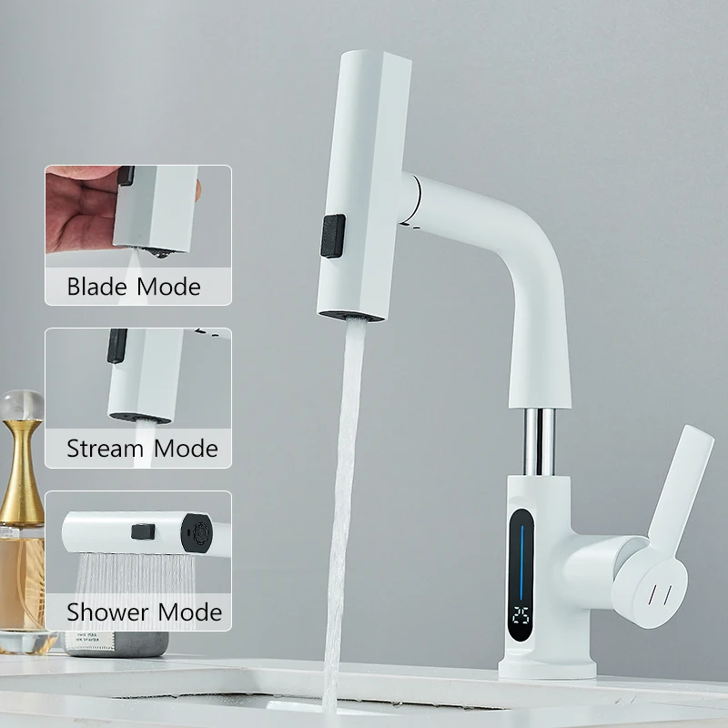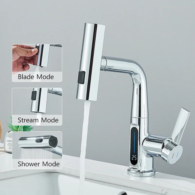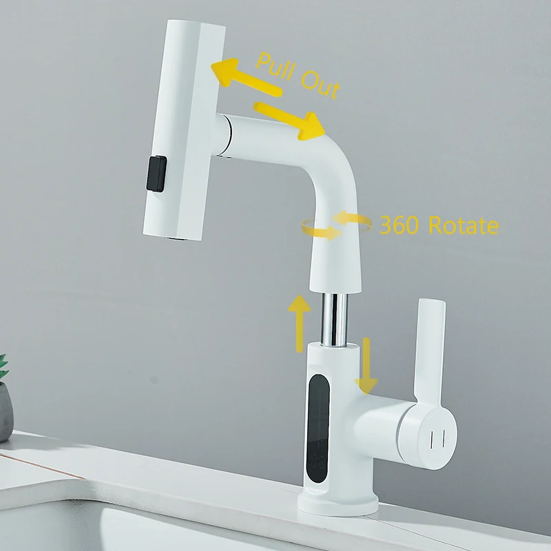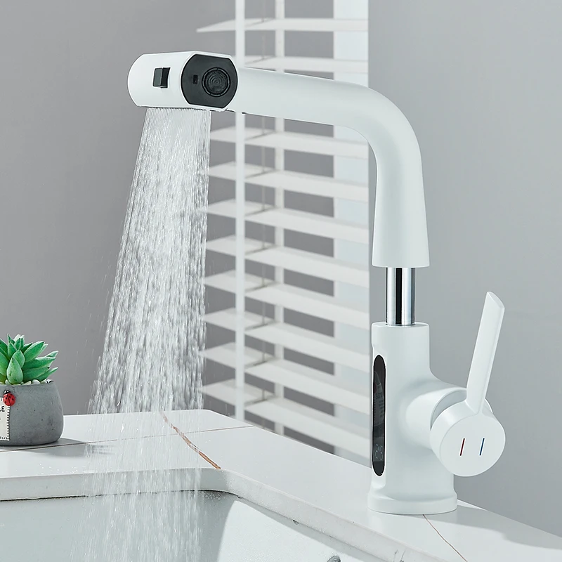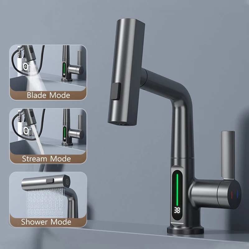 Cascade température affichage numérique robinet de lavabo soulever vers le bas flux pulvérisateur eau chaude froide évier mélangeur robinet de lavage pour salle de bain