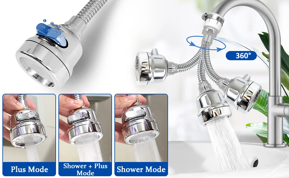 【Réglable 3 Modes d’eau】 Aérateur de robinet pivotant avec mode plus, mode douche et mode douche + mode plus 3 modes au total. Chaque mode peut économiser 50% d’eau par rapport aux robinets étincelants standard, ce qui permet d’économiser efficacement les ressources en eau.