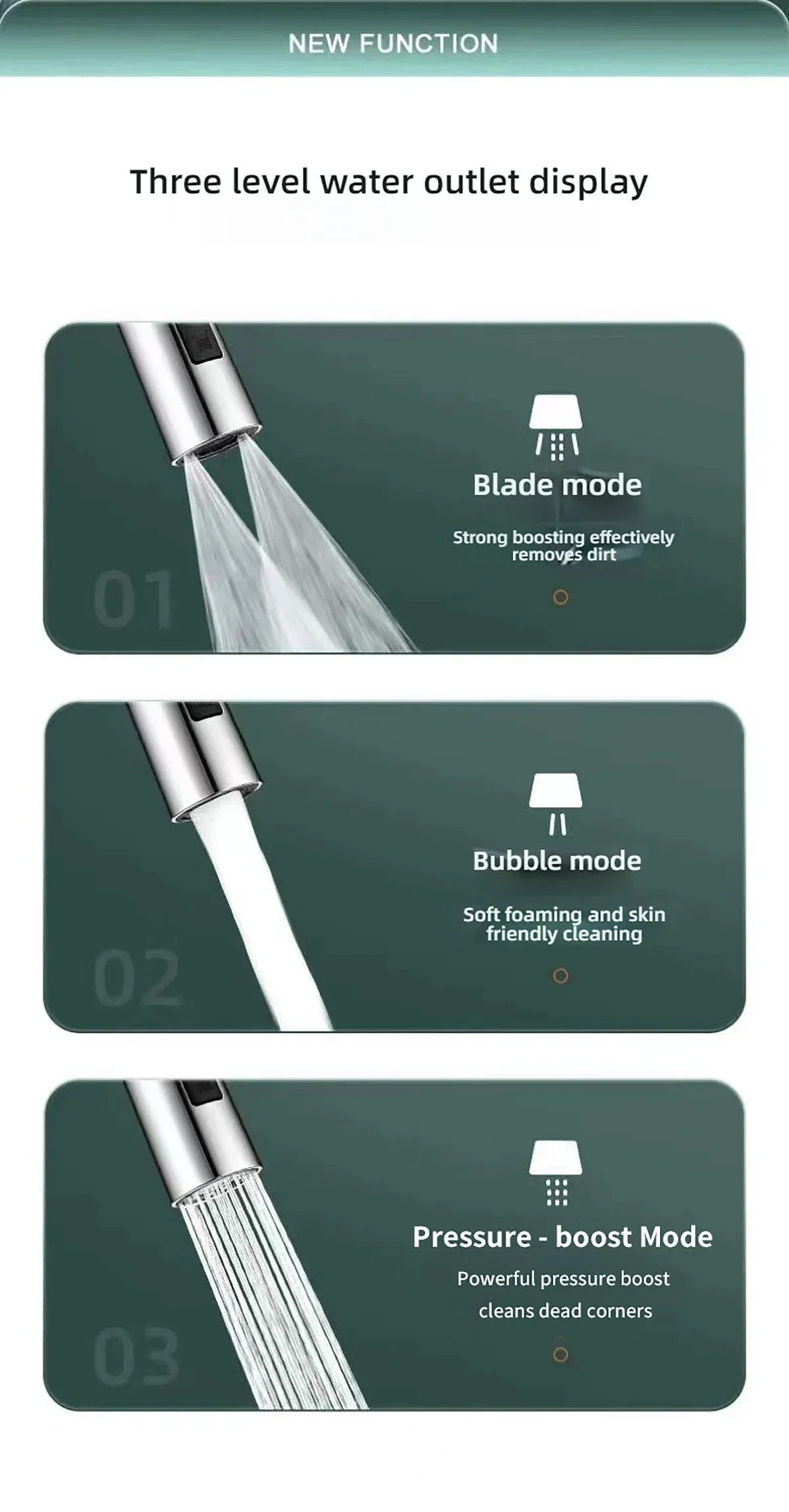 Mode de distribution d’eau : Il y a trois modes de distribution d’eau, y compris le Mode Blade (presurisation puissante, élimine efficacement la saleté), Mode Bubble (mousse souple, nettoyage respectueux de la peau) et Mode pressurisé (puissance puissante, nettoyage des coins morts).