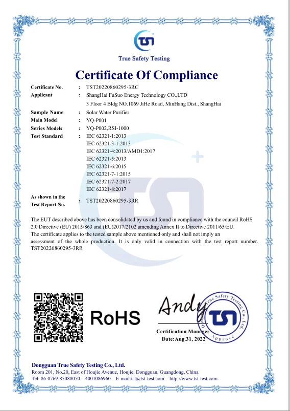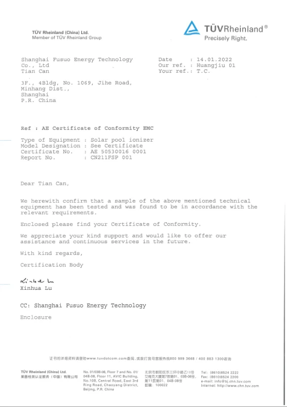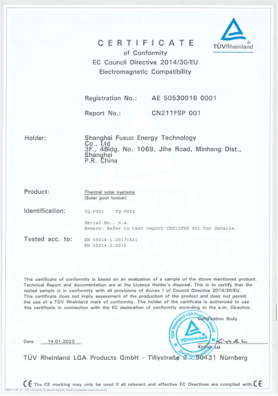 L’ioniseur de piscine solaire a passé le certificat CE-EMC et le certificat ROHS