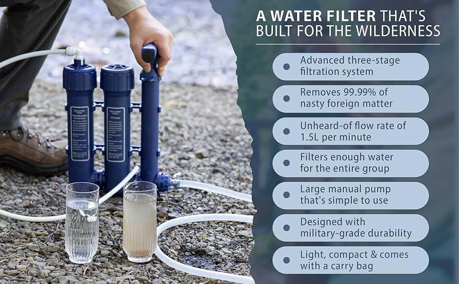 –Nom : purificateur d’eau à pression manuelle (filtration à double étage)
