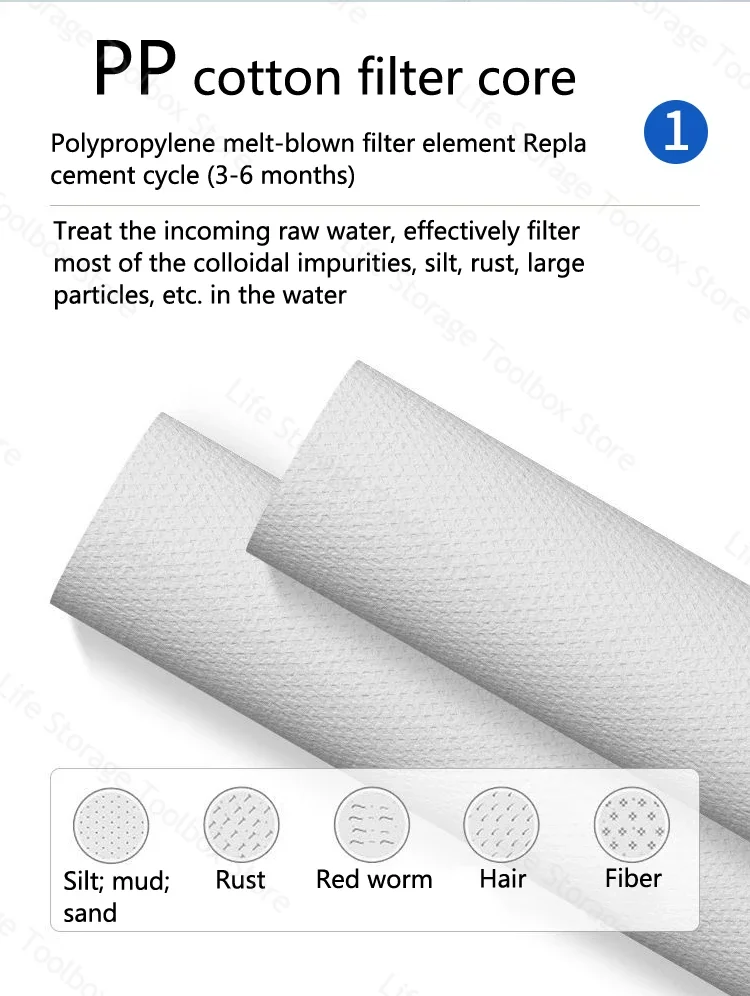 ▲La première couche et la troisième couche sont des filtres en coton propathène, une filtration efficace de sédiments de > 5 μm et de la rouille dans l’eau, une grande zone de filtration et une absorption de la saleté.