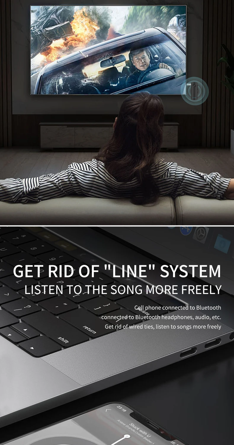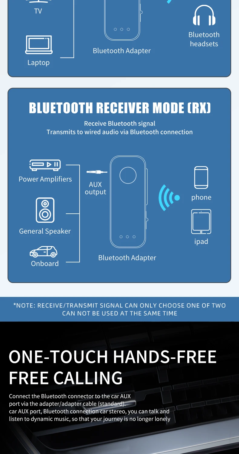 ●Récepteur et émetteur audio 2 en 1 : ce adaptateur peut être utilisé comme récepteur et émetteur audio, vous permettant de connecter votre TV, PC, ou une voiture à votre téléphone ou d’autres appareils sans fil.