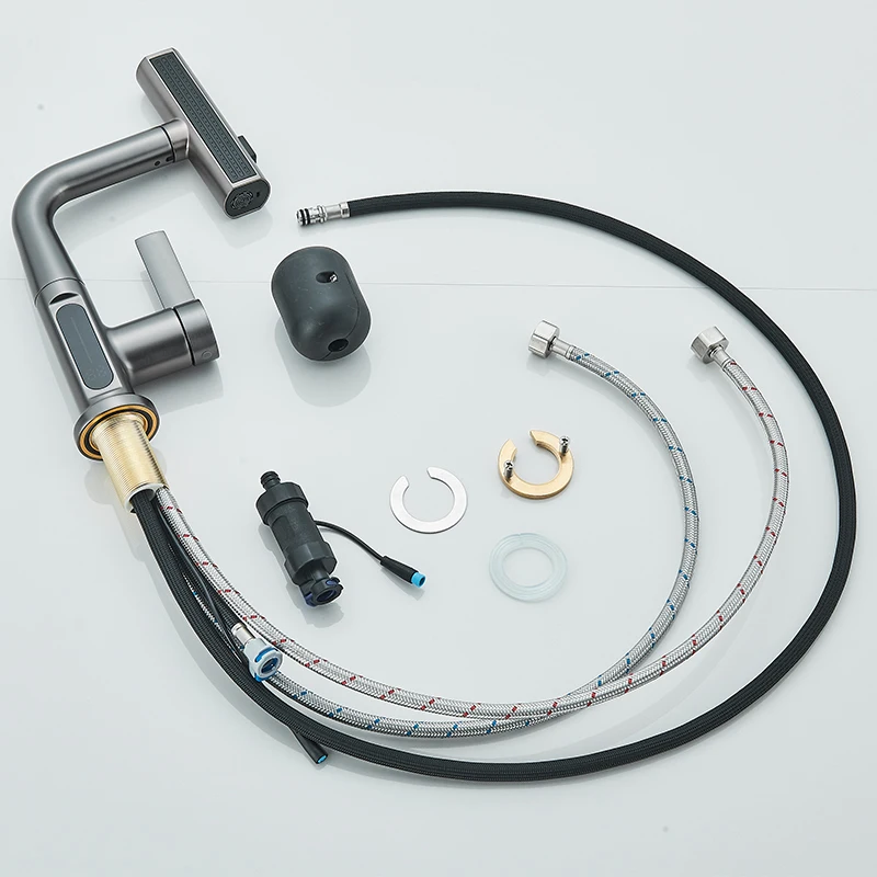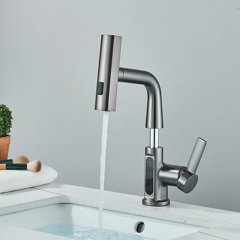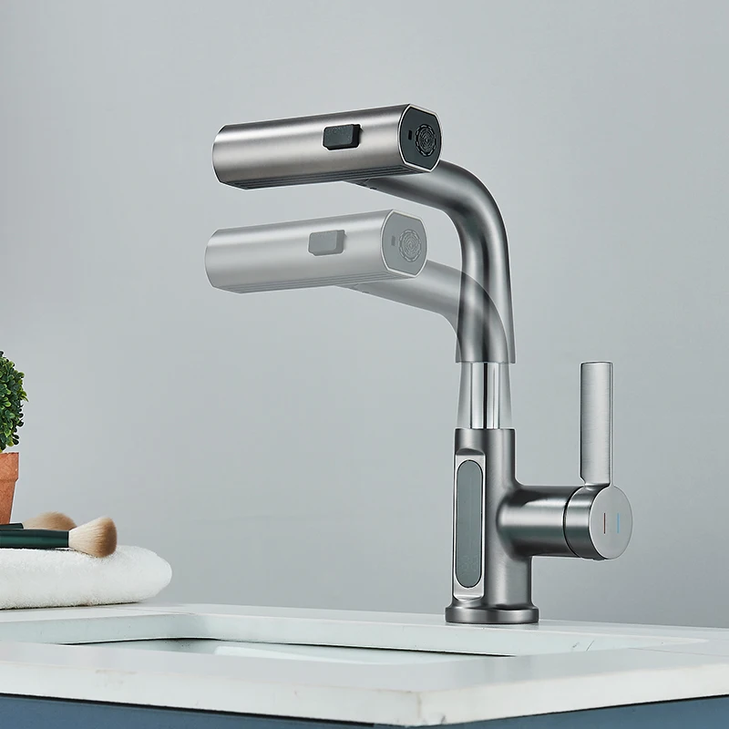 Bassin de Cascade en Laiton Monté sur Pont, Pistolet de Luxe Rotatif, Gris, Évier Chaud et Froid, Robinet de Lavabo