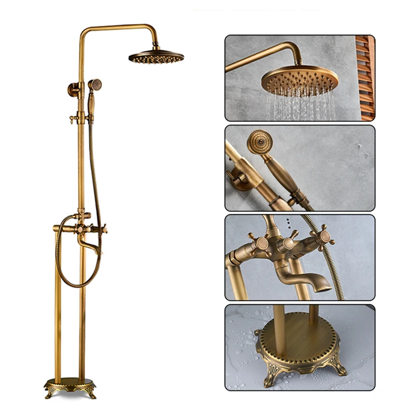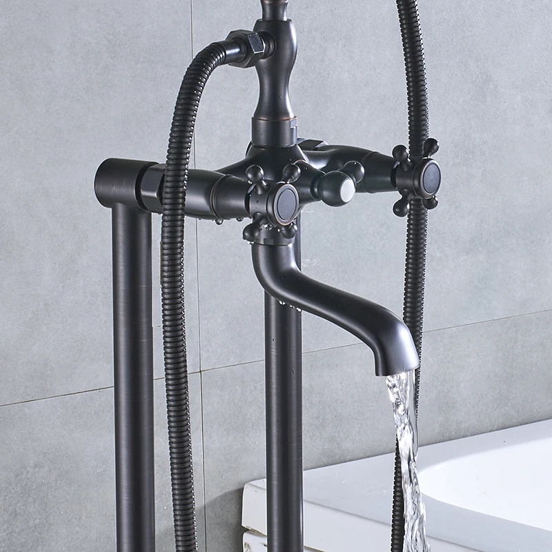 Robinet de baignoire de salle de bains sur pied en laiton Antique de luxe, ensemble de douche, bec pivotant à double poignée, tuyau de douche de 150cm, mélangeur chaud et froid
