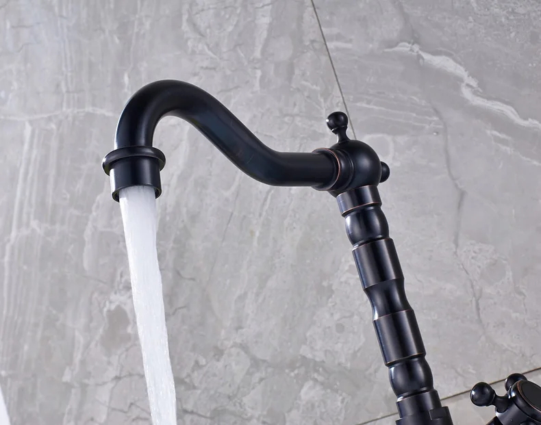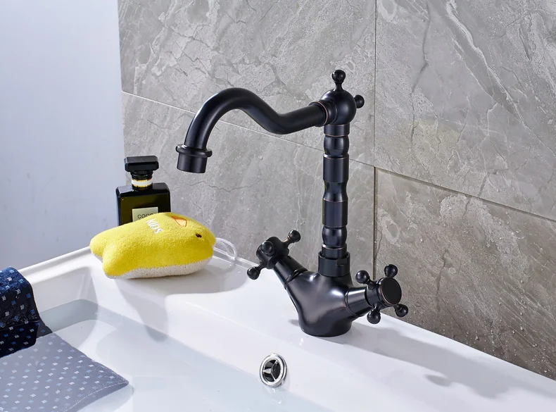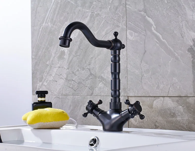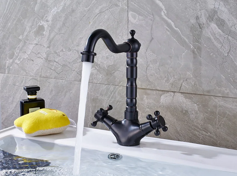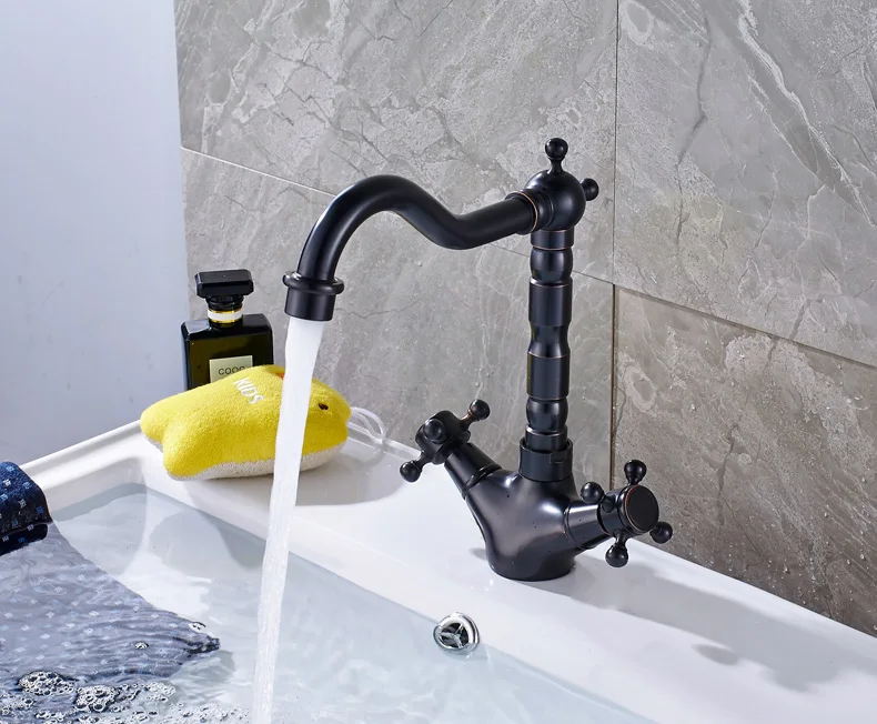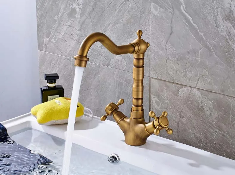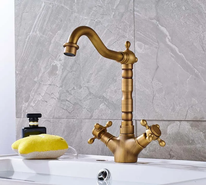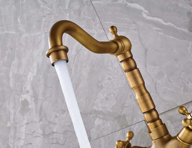 Robinet mélangeur pivotant à double poignée pour évier de salle de bain et de cuisine en laiton antique avec eau chaude et froide montée sur le pont