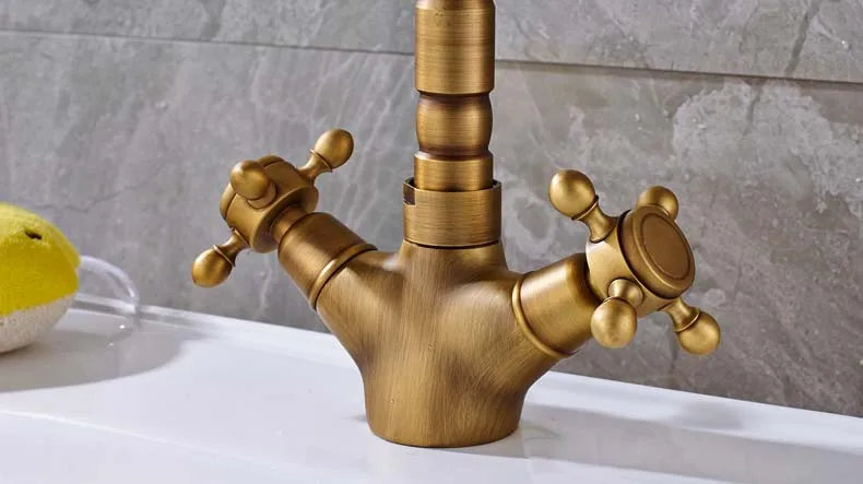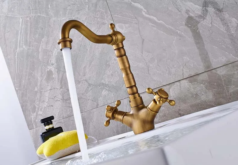 Robinet mélangeur pivotant à double poignée pour évier de salle de bain et de cuisine en laiton antique avec eau chaude et froide montée sur le pont