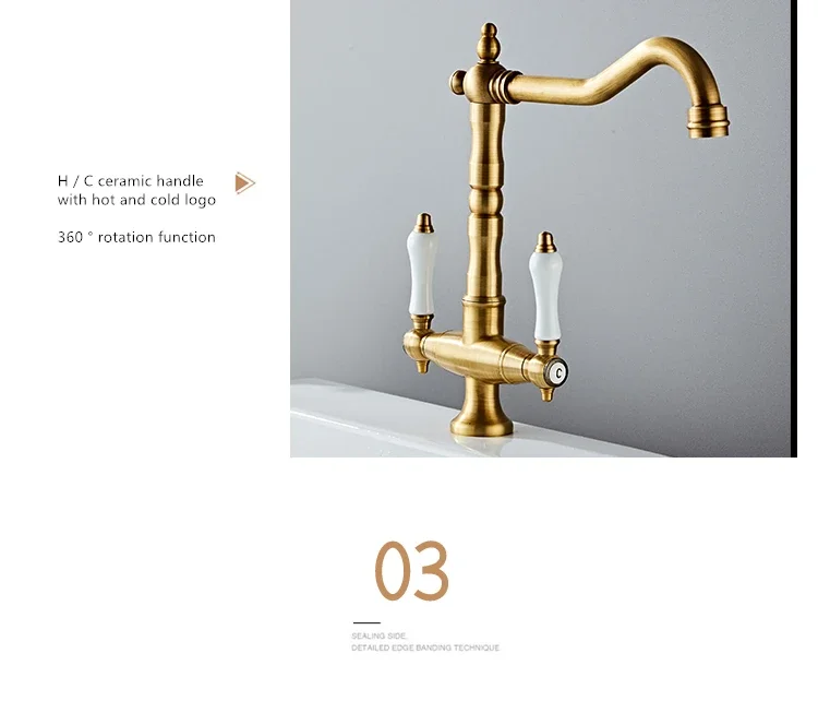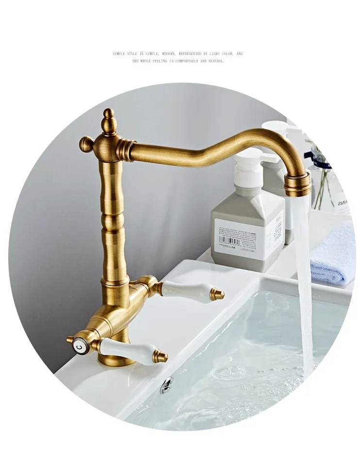 Nom: robinet de cuisine à double poignée en laiton Antique, robinet rétro rotatif à 360 degrés, robinets d’évier de cuisine, mélangeur d’évier de salle de bains monté sur le pont