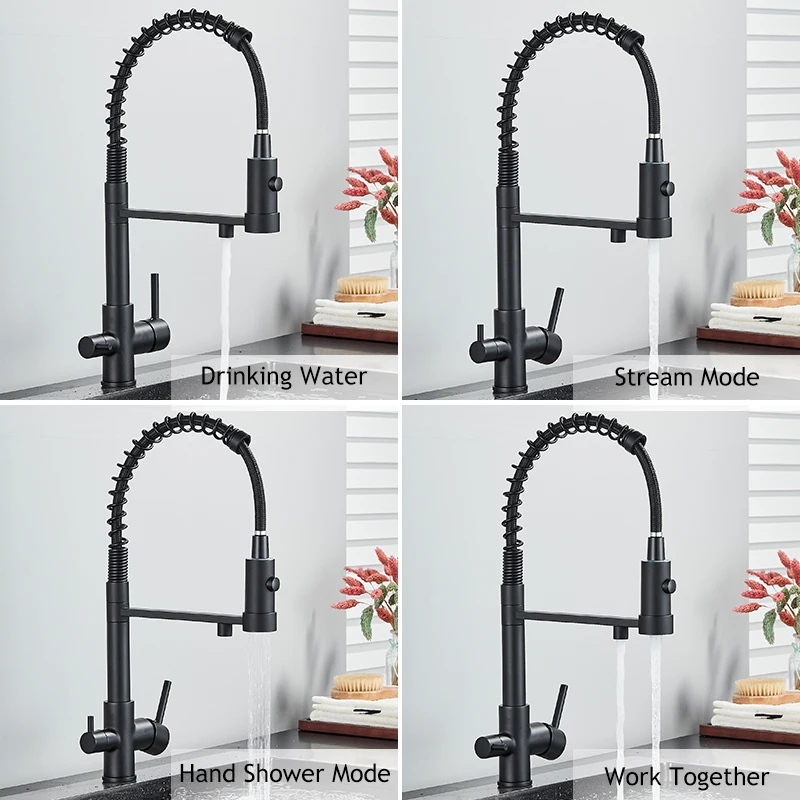 Robinet de cuisine à eau potable, robinet d'évier de cuisine noir, robinet de cuisine en laiton avec filtre 360 ° Mélangeur d'évier rotatif double mode