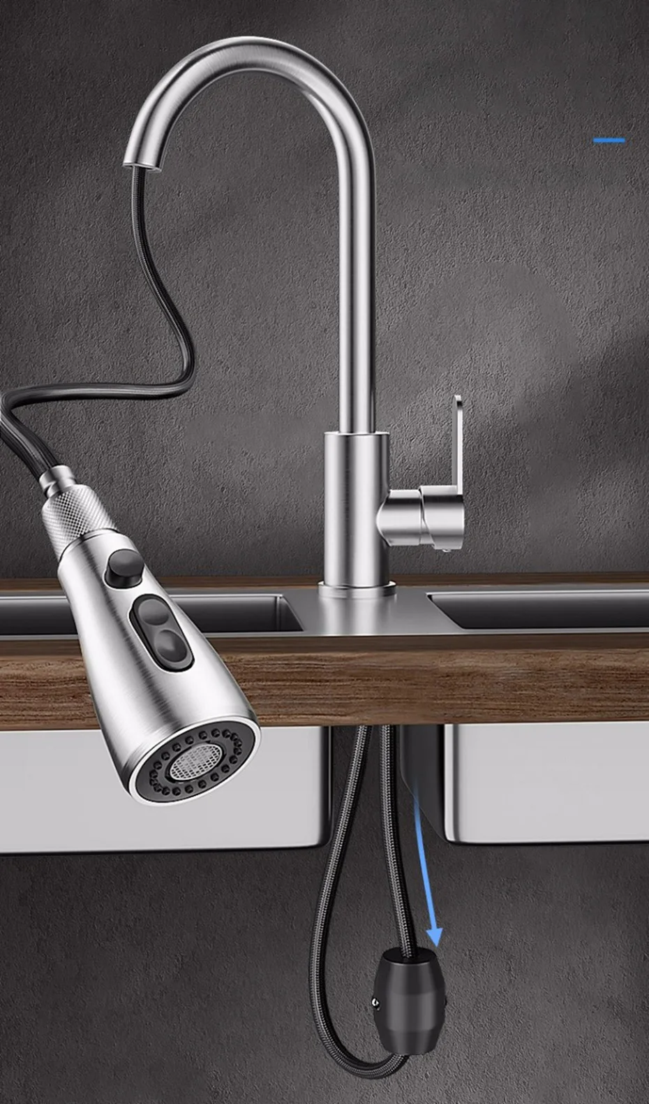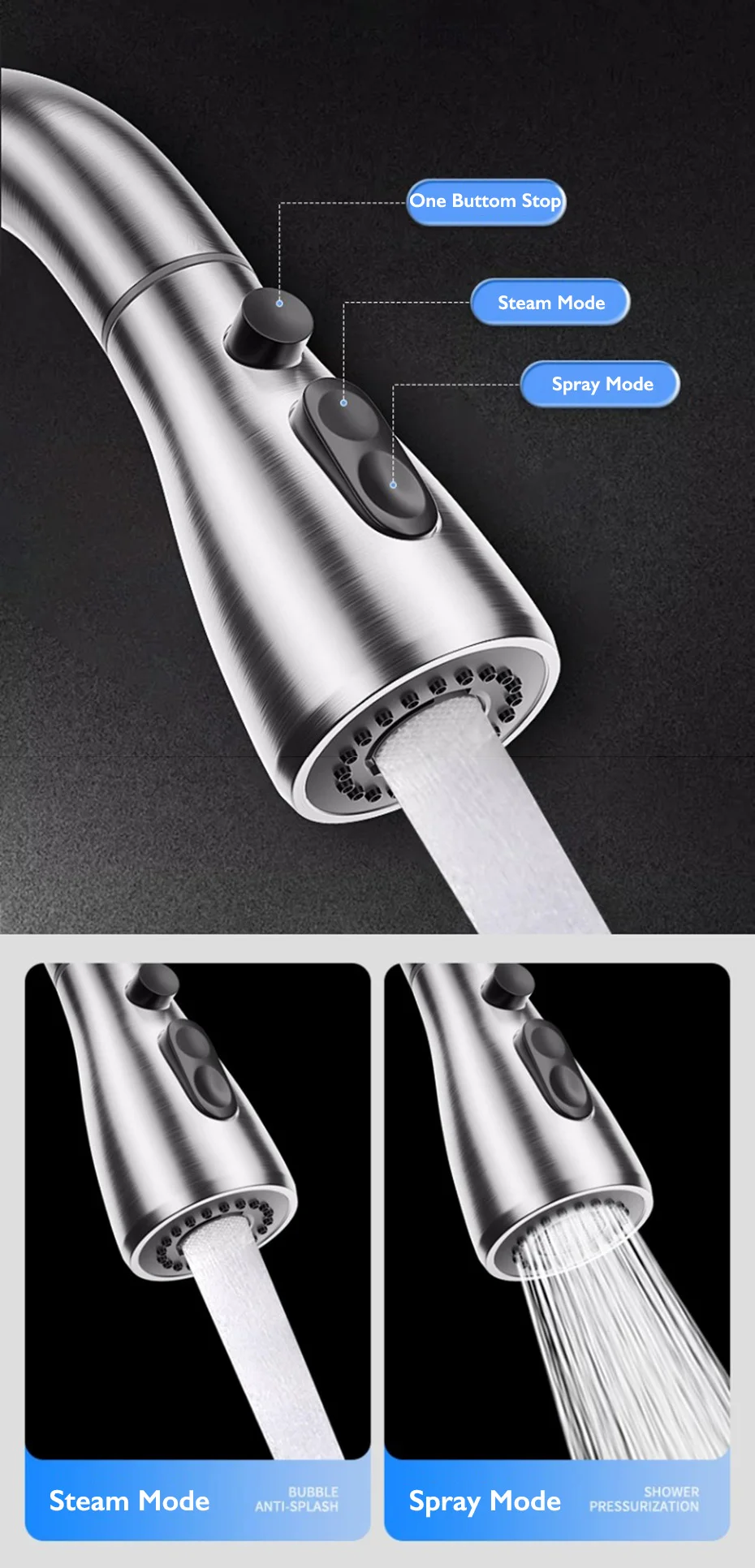 • Buse double modes : le robinet a deux modes d’écoulement d’eau (mode eau amont et mode eau de pulvérisation), chaud et froid, rend-le pratique pour diverses besoins de cuisson.