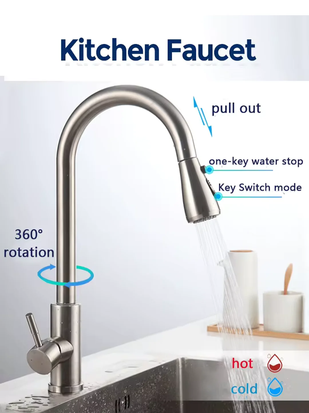 • Three functions :Ce robinet de cuisine est équipé de trois buse fonctionnelles – chaude, froide et pulvérisateur – offrant une variété d’options pour vos besoins de lavage et de cuisson.