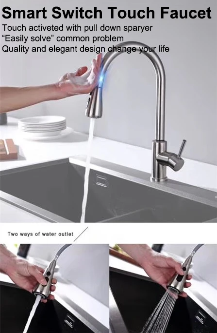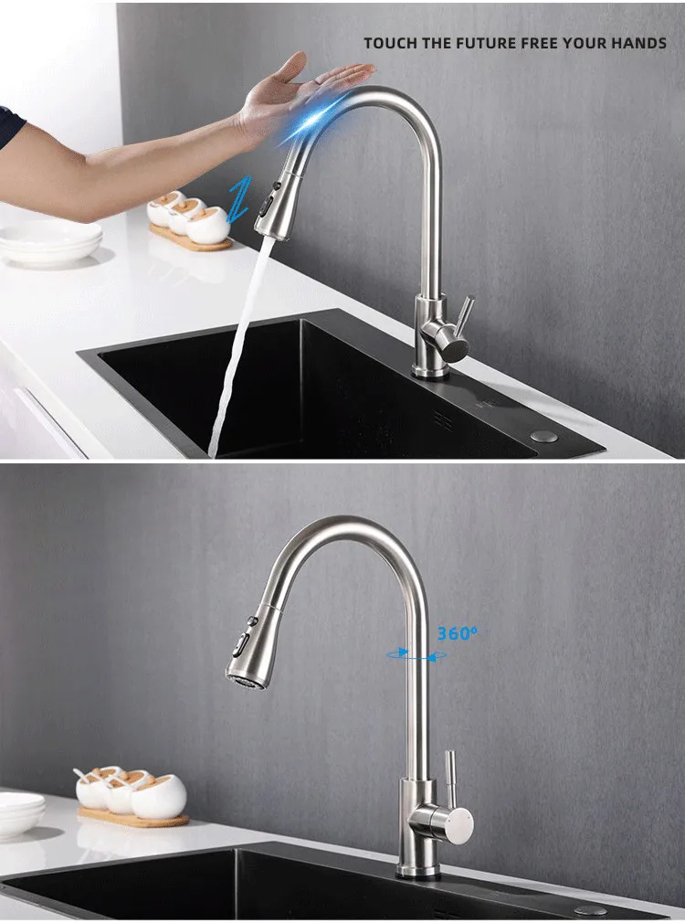 Technologie de contrôle tactile d’assistance: une simple pression sur le bec ou le corps des robinets d’évier de cuisine commence et arrête l’écoulement de l’eau pour une conception de nettoyage presque sans contact.