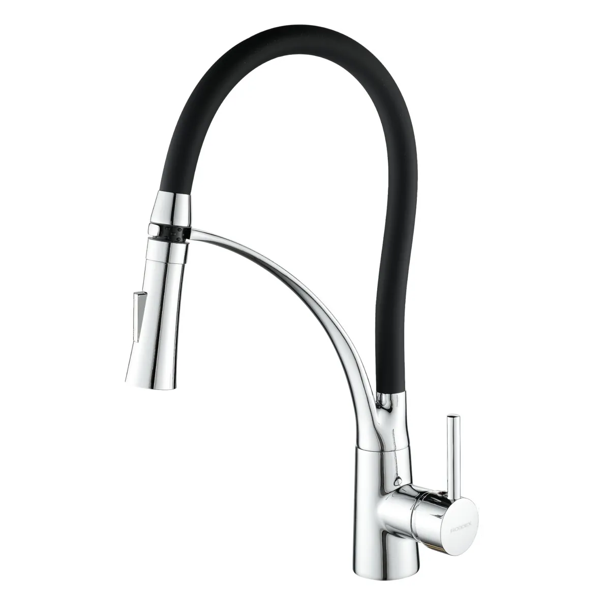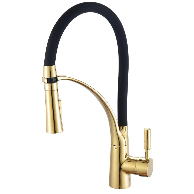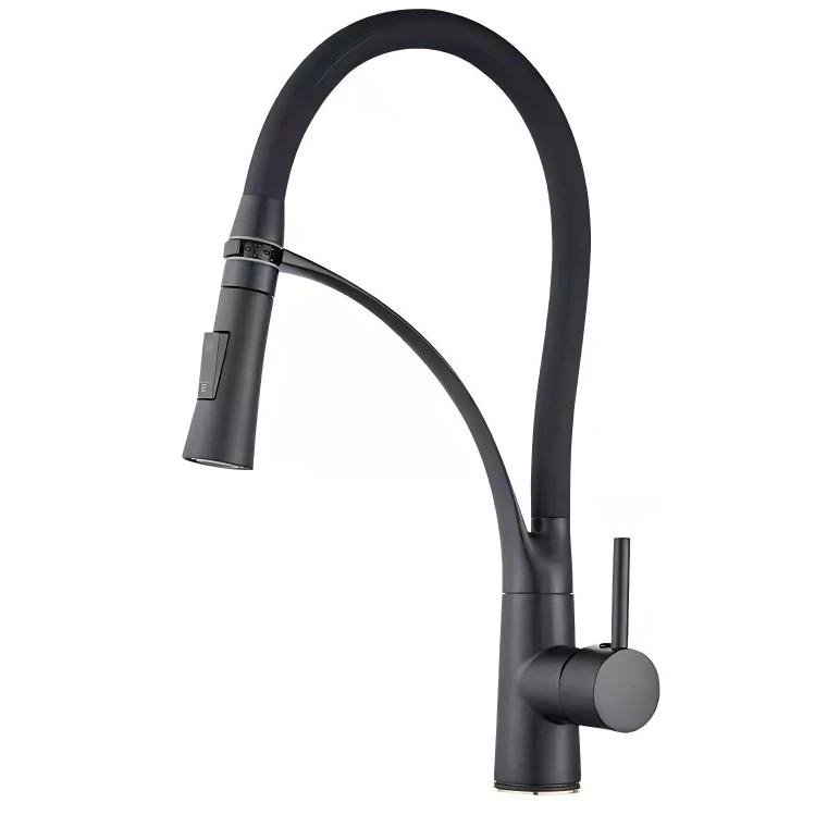 Robinet de cuisine extractible avec buse flexible en silicone, poignée unique, col de cygne extractible en laiton et design moderne à courbe élevée.Robinet de cuisine extractible avec buse flexible en silicone, poignée unique, col de cygne extractible en laiton et design moderne à courbe élevée.