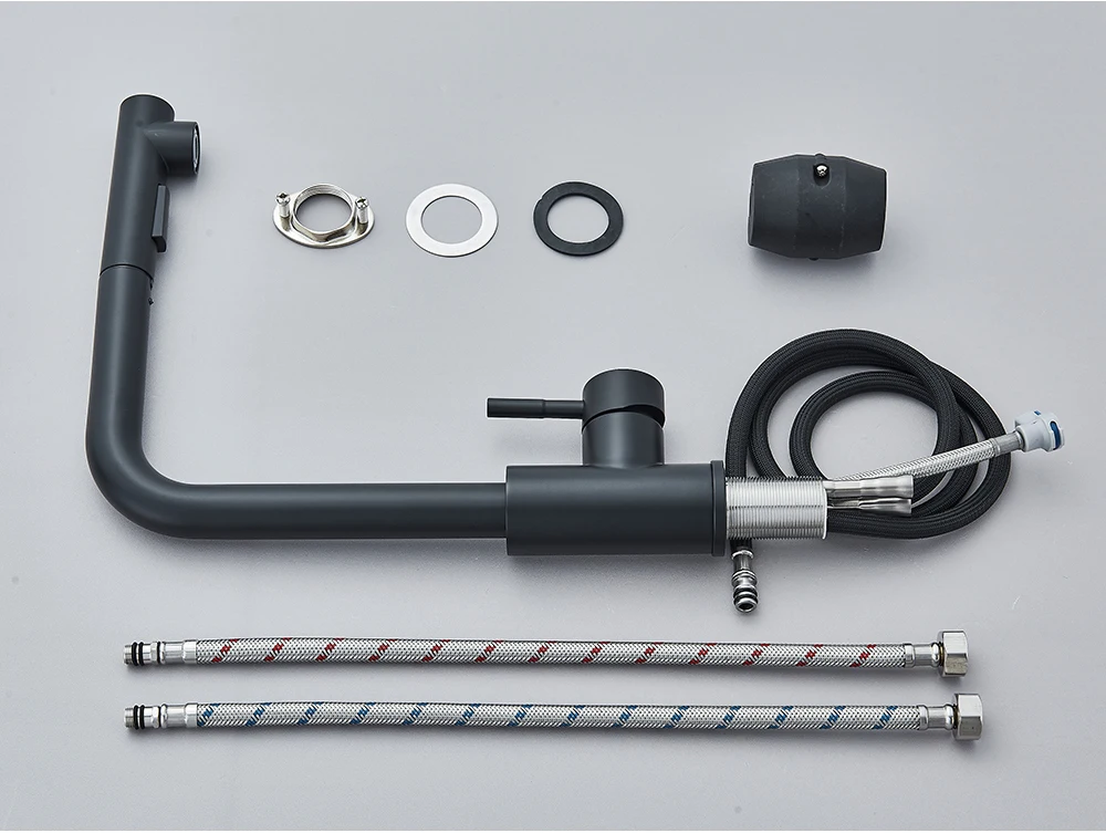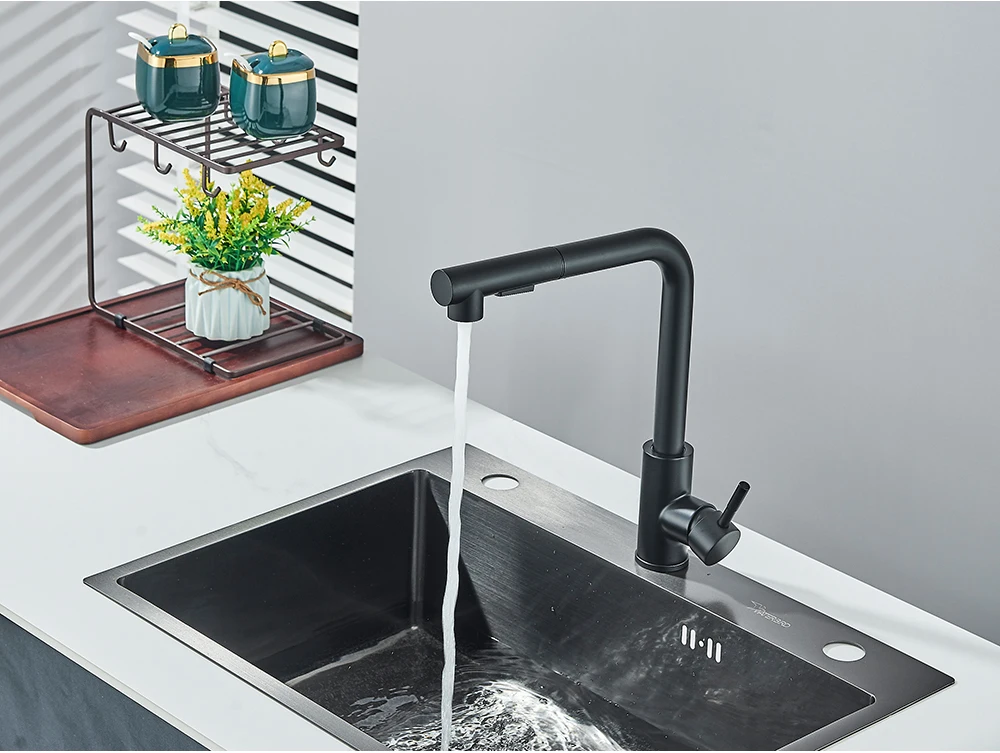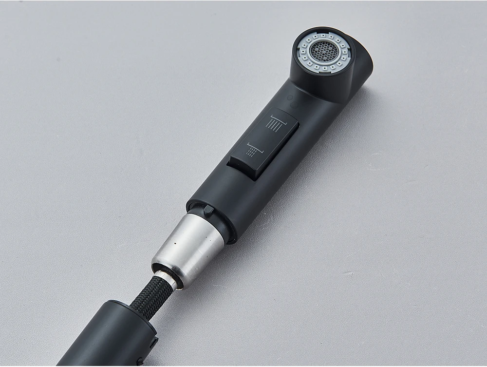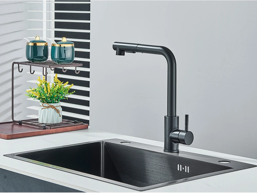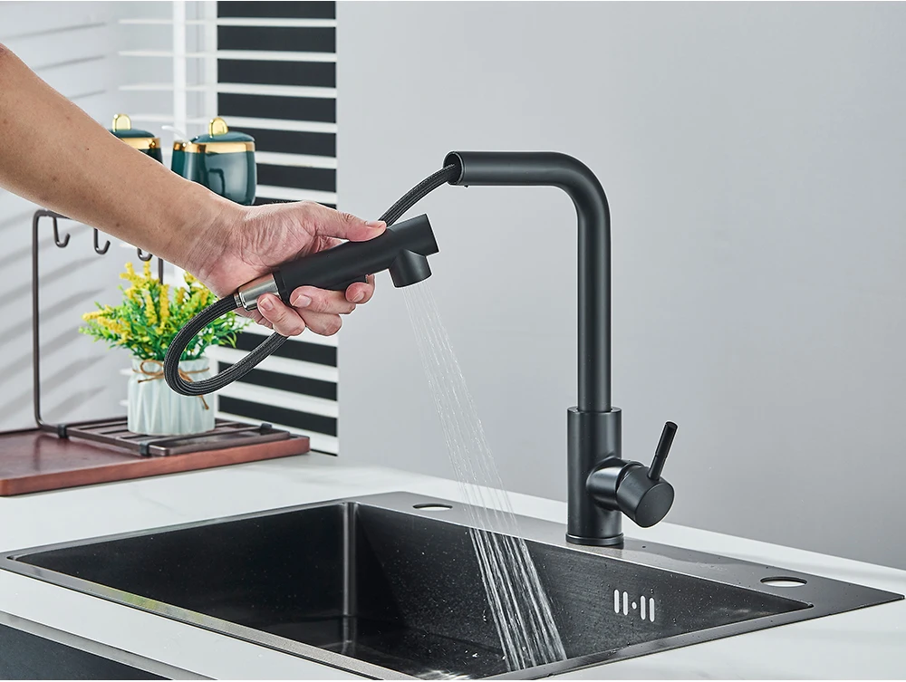 Robinet de cuisine extractible noir, robinet d’évier de cuisine monté sur le pont, mélangeurs de cuisine à poignée unique, bec rotatif, tête de pulvérisation à jet