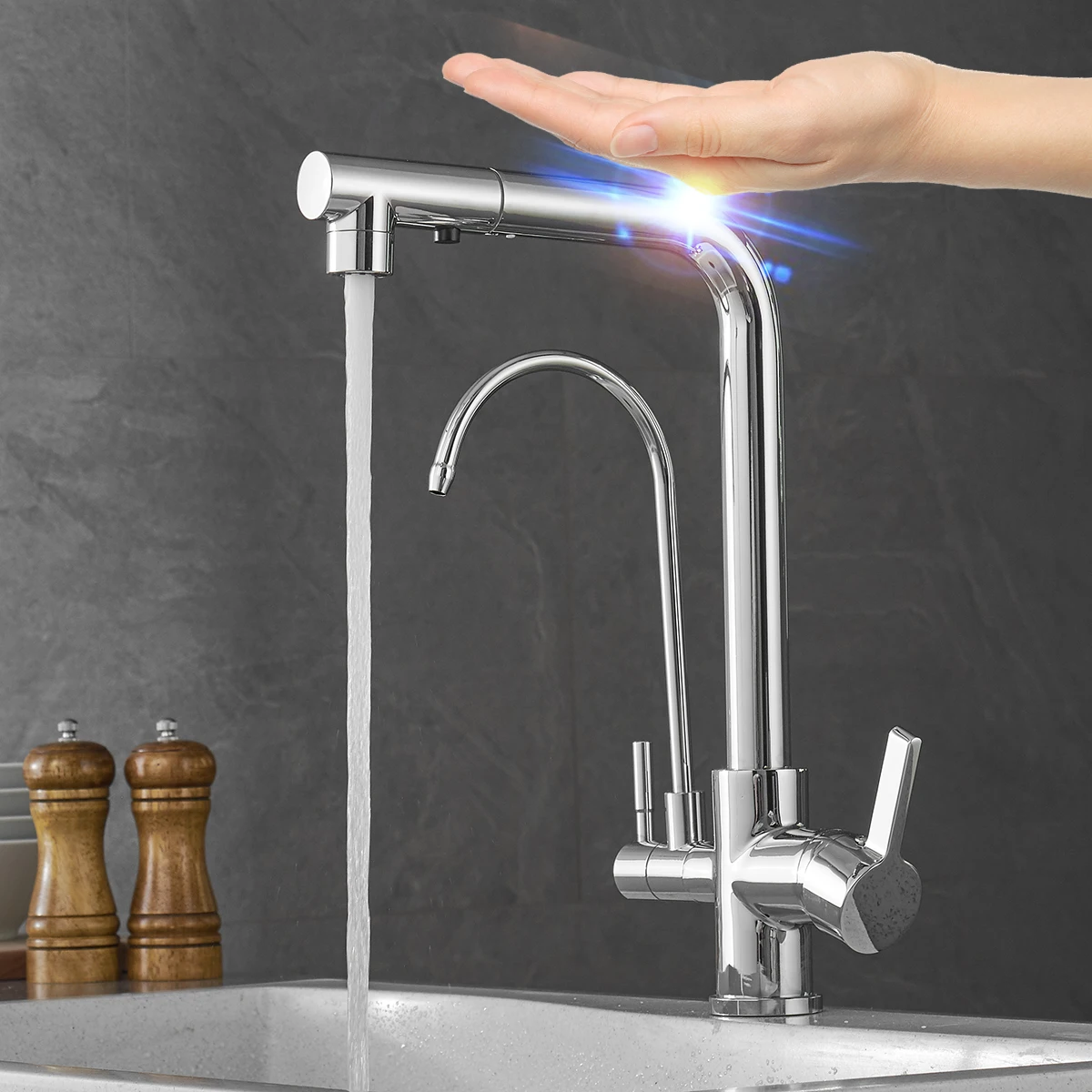 [Robinet de cuisine tactile]: la fonction Touch on peut être effectuée en utilisant votre poignet, votre avant-bras ou toute autre partie du corps pour démarrer et arrêter sur le bec du robinet. Une seule poignée est utilisée pour contrôler le débit d’eau et l’eau chaude/froide manuellement. Il s’arrête automatiquement après 2 minutes pour éviter d’oublier de l’éteindre.