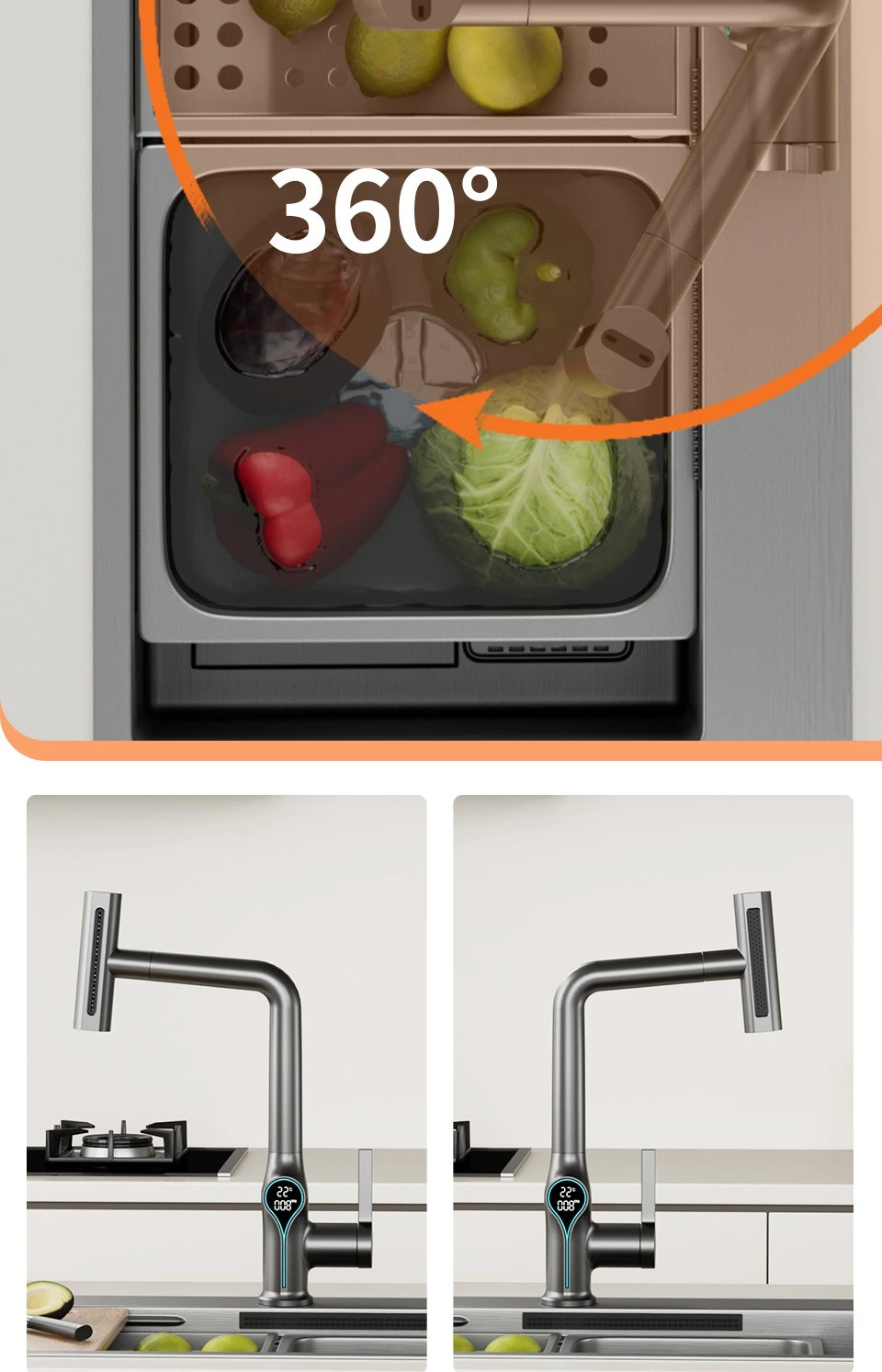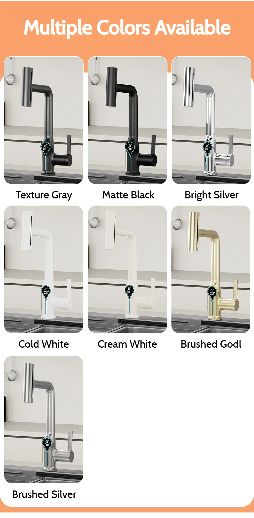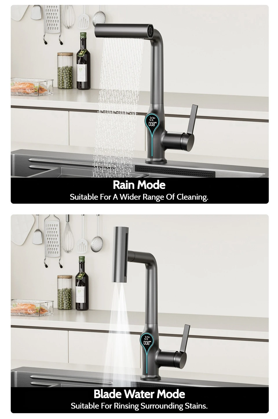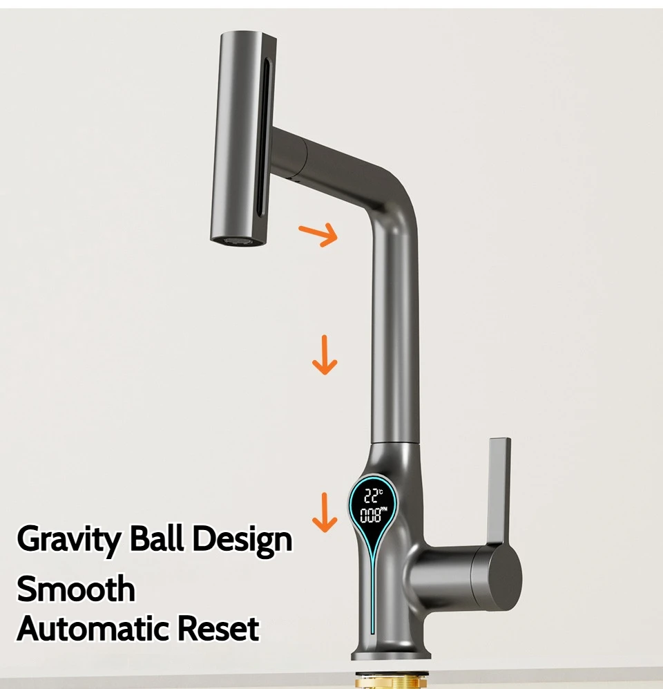 Robinet de cuisine gris, affichage numérique de la température, robinet de lavabo extractible, 4 Modes de levage, pulvérisateur, eau chaude et froide, mélangeur d’évier, robinet de lavage