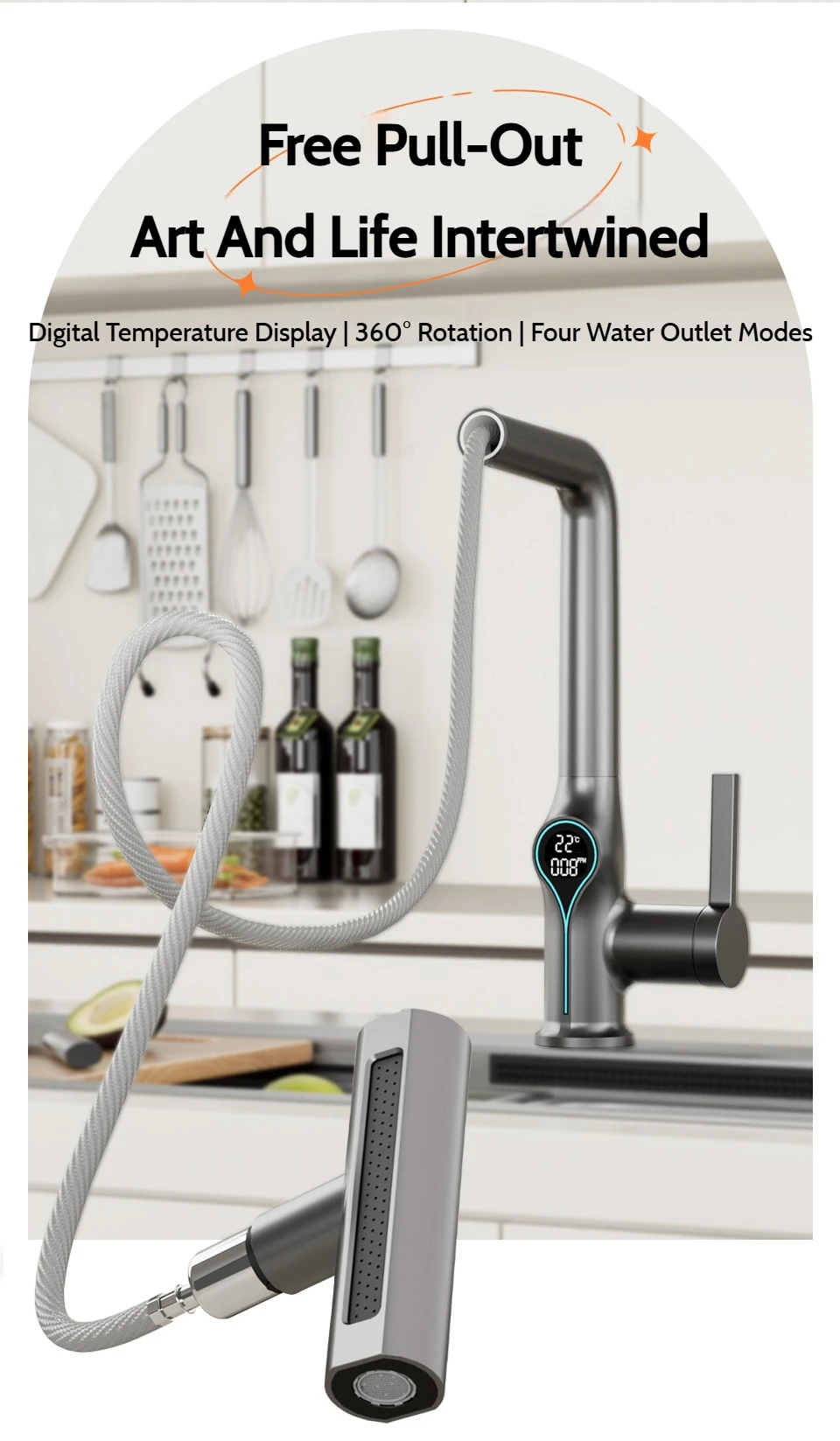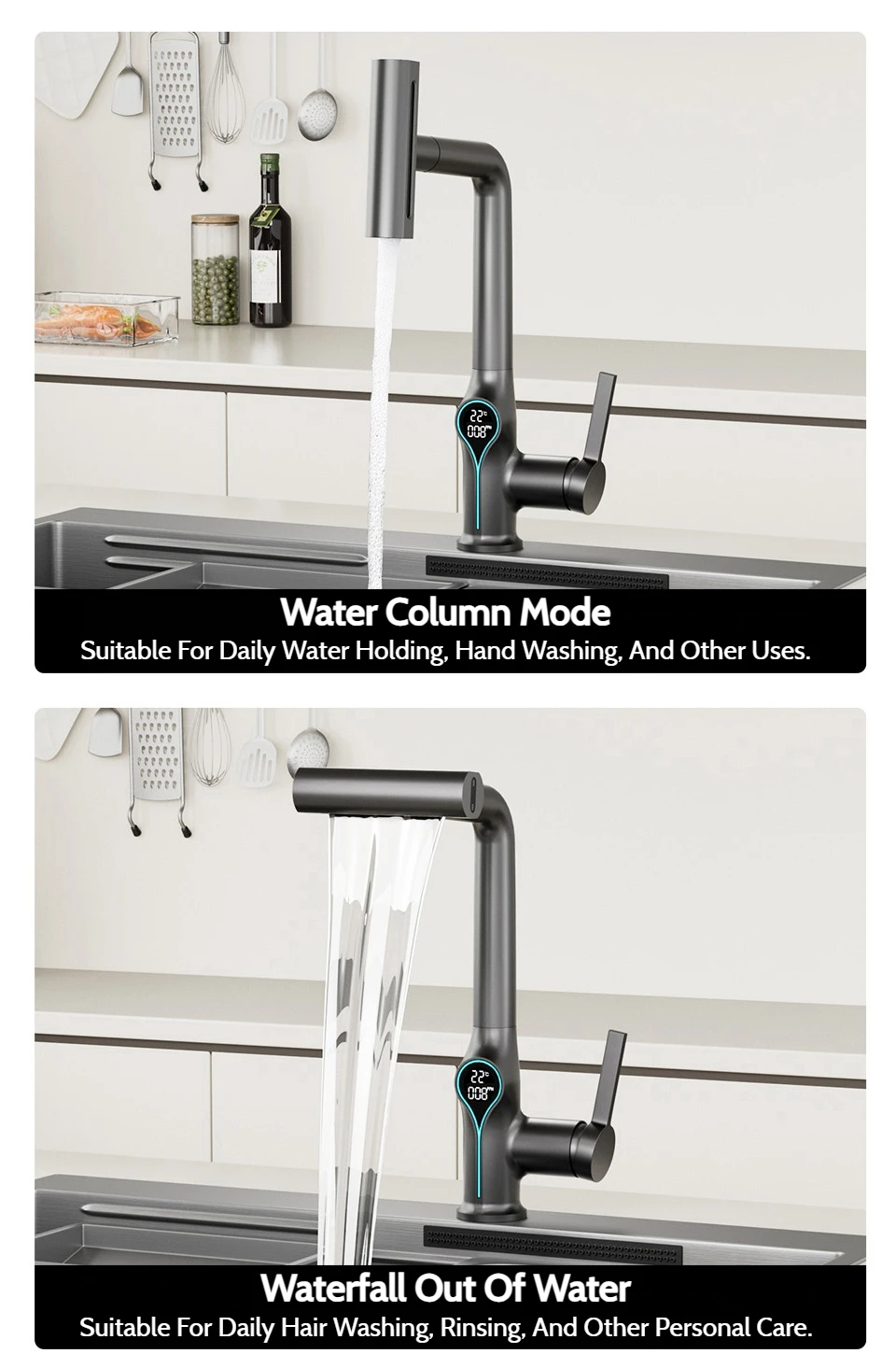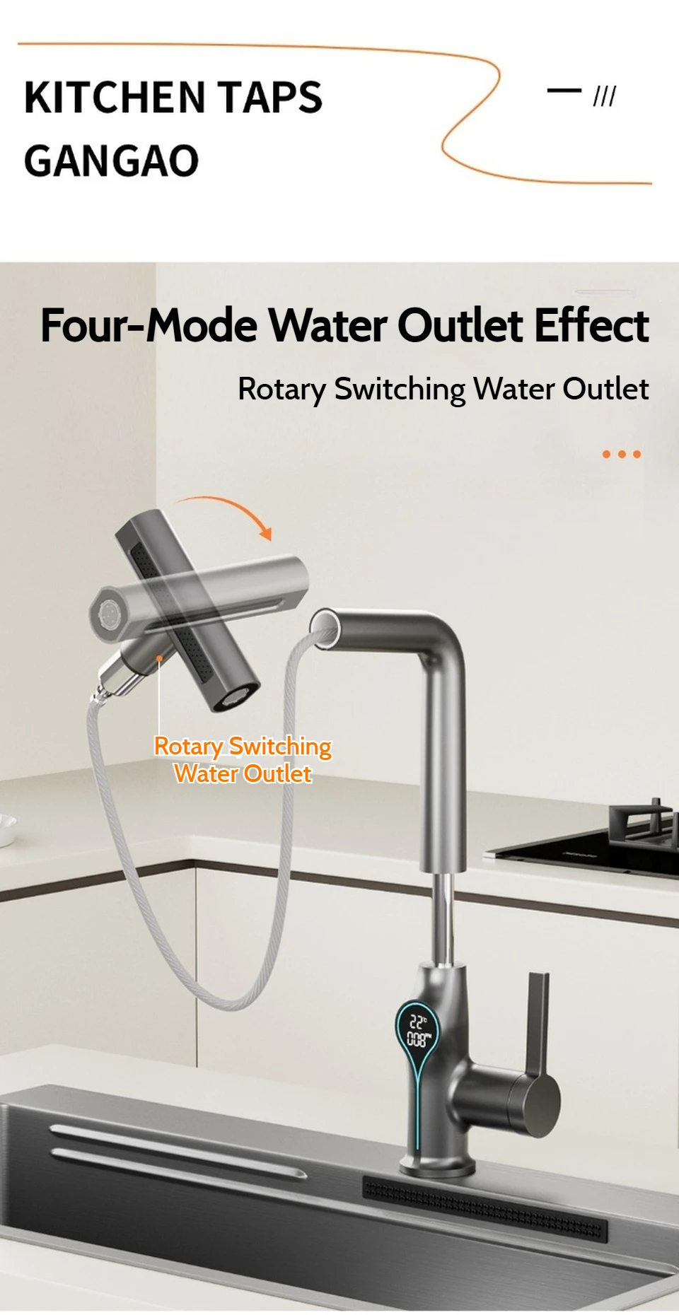 Robinet de cuisine gris, affichage numérique de la température, robinet de lavabo extractible, 4 Modes de levage, pulvérisateur, eau chaude et froide, mélangeur d’évier, robinet de lavage