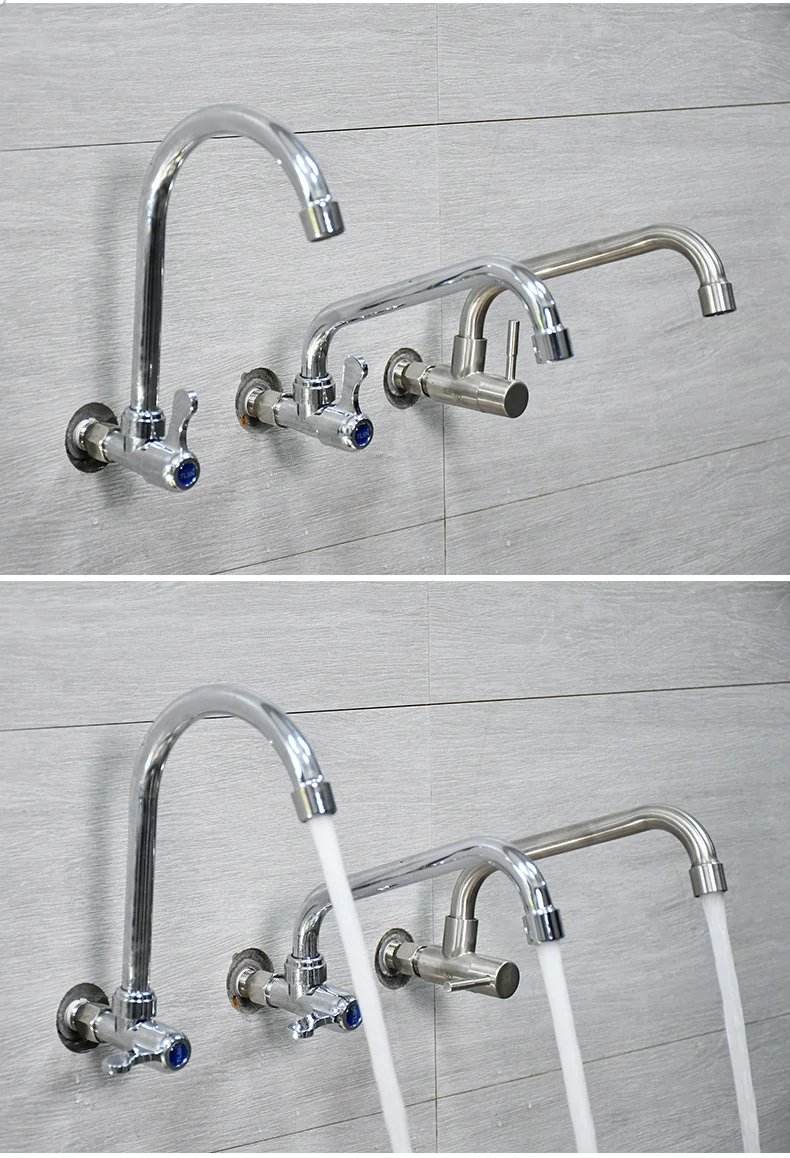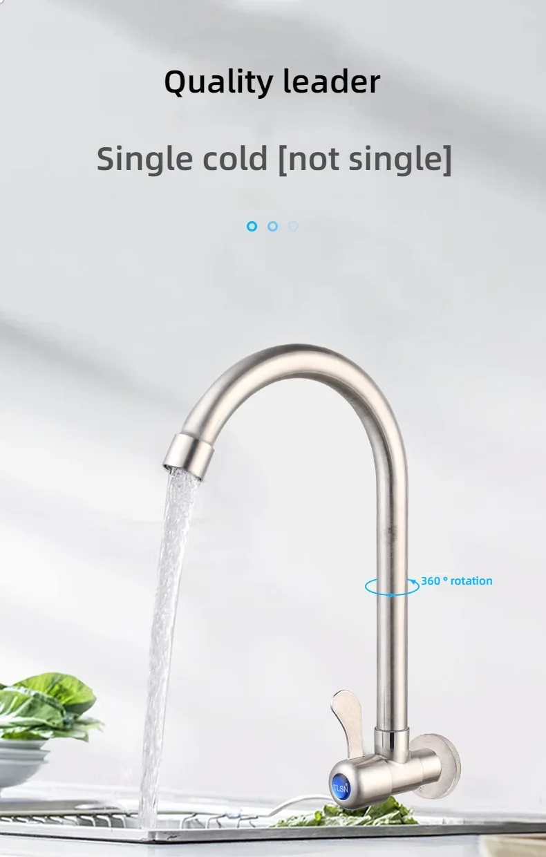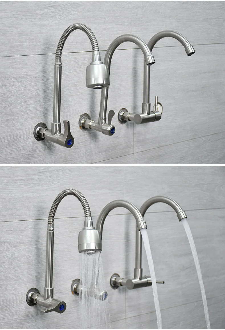 Robinet de cuisine mural en acier inoxydable, robinet d’eau froide simple, courbe inférieure, robinet d’évier mural, qualité supérieure