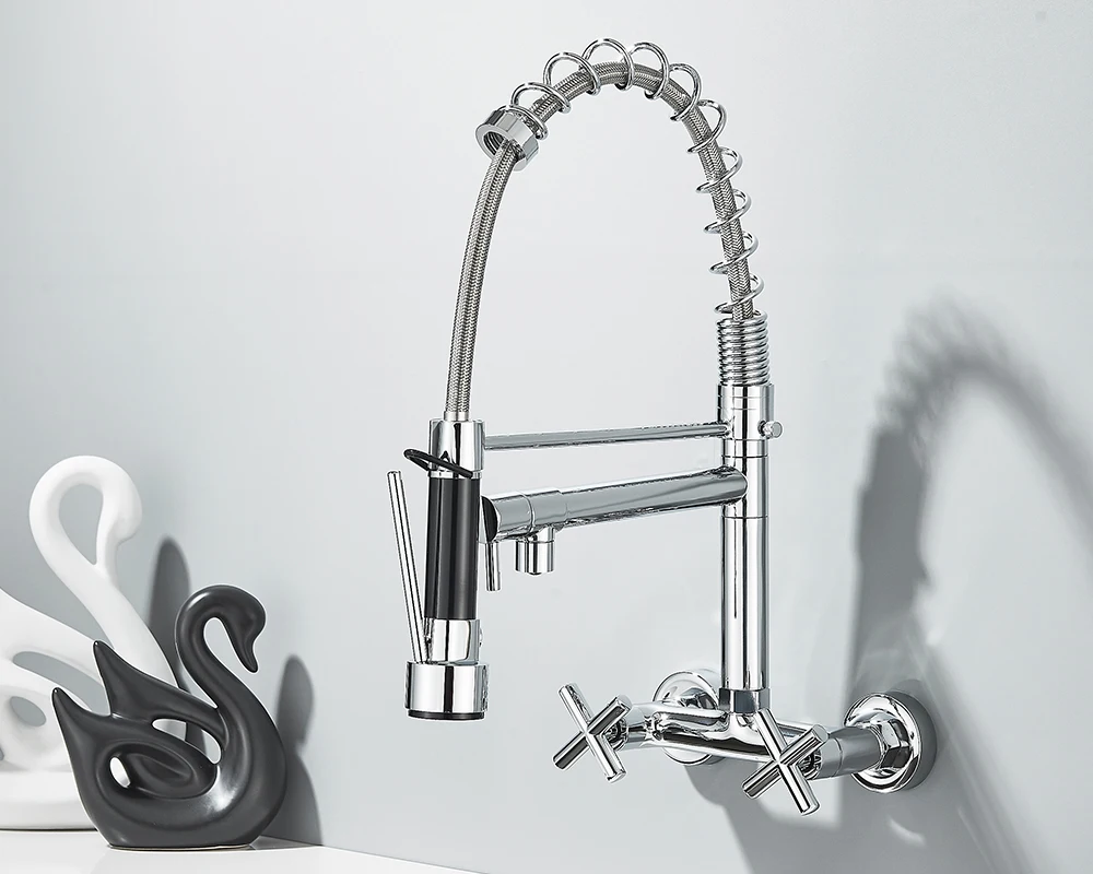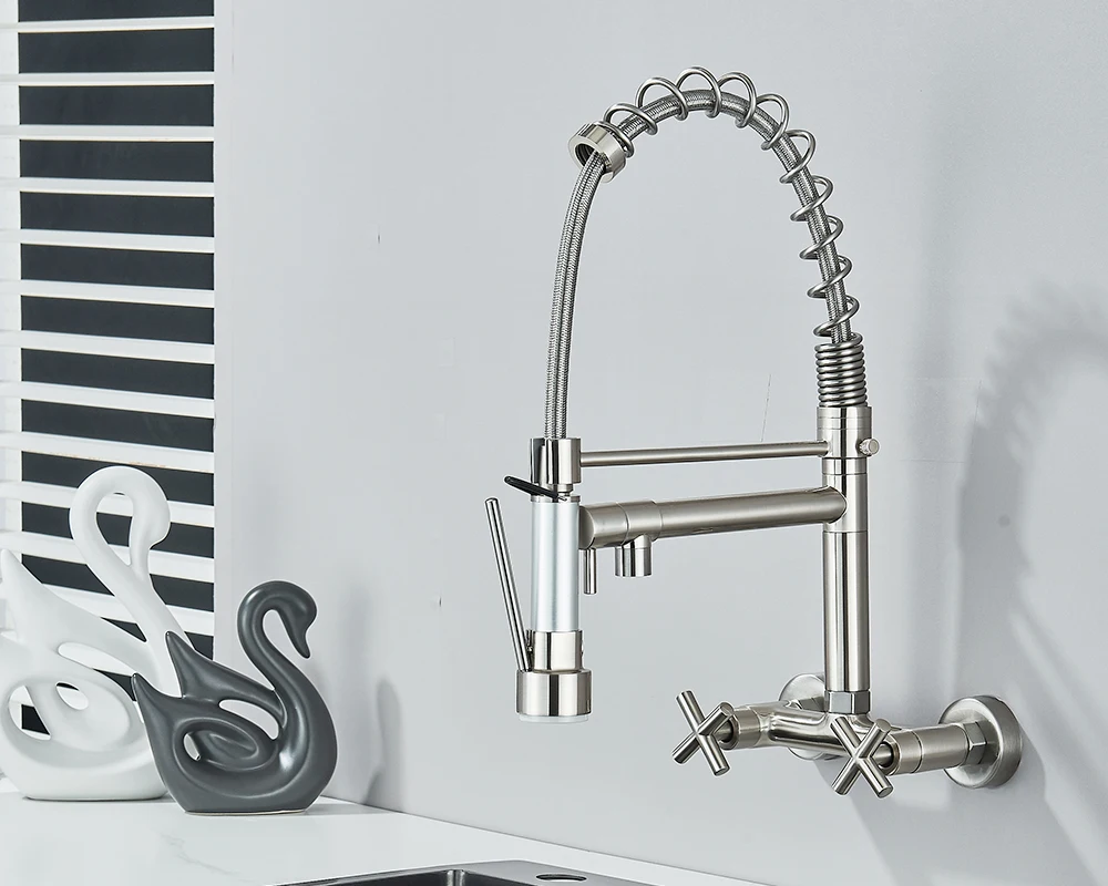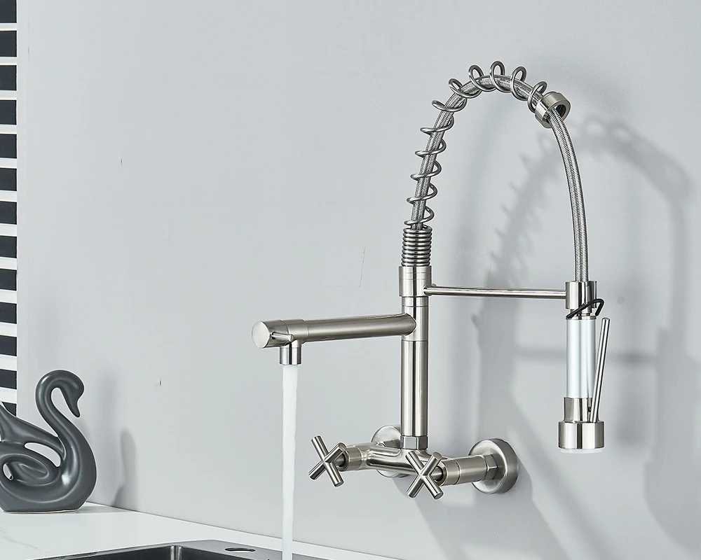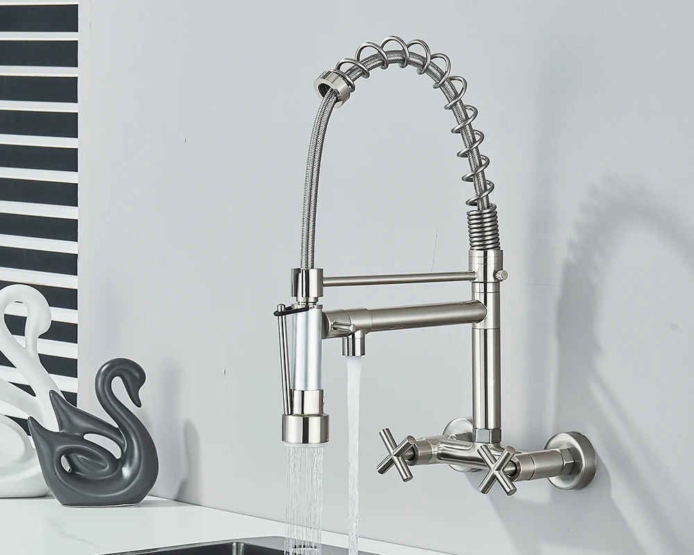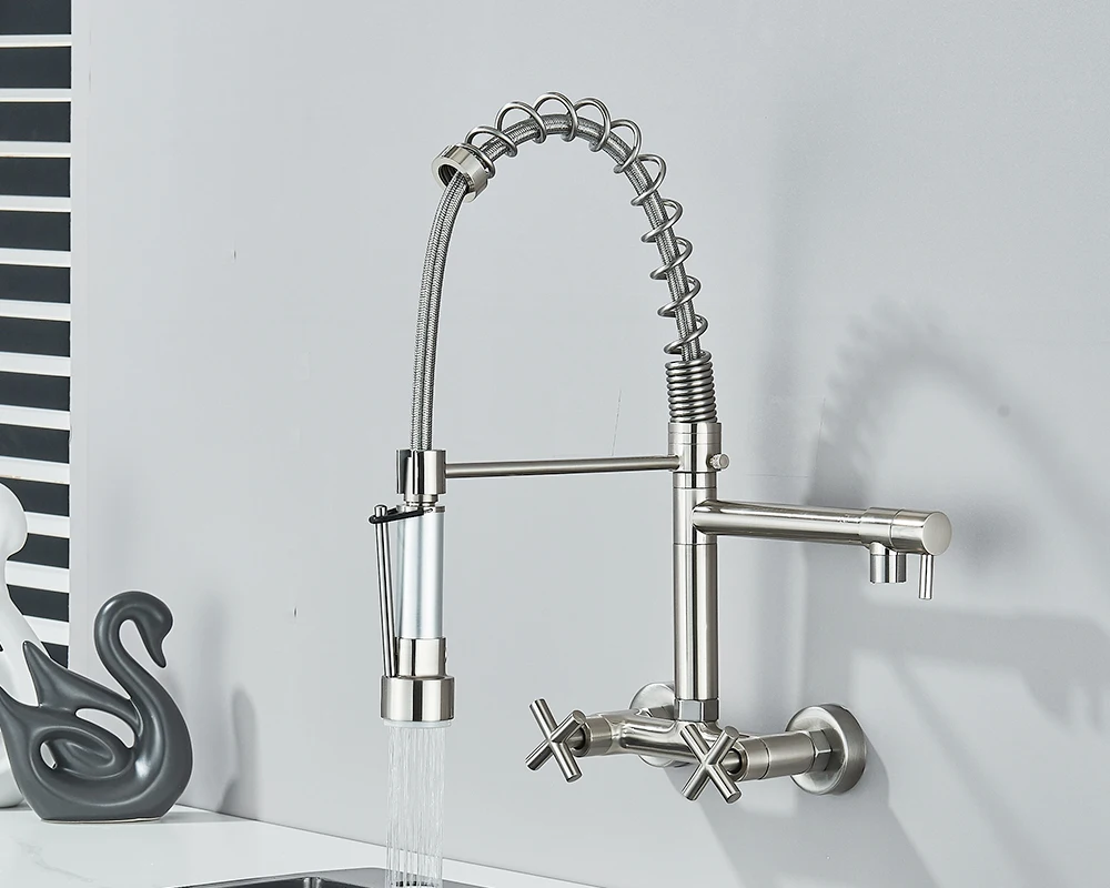 Soyez le premier à laisser votre avis sur “Robinet de cuisine mural en côtes vers le bas, eau chaude et froide, bec de printemps pour touristes, distance de 20cm pour deux trous”