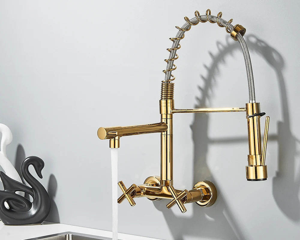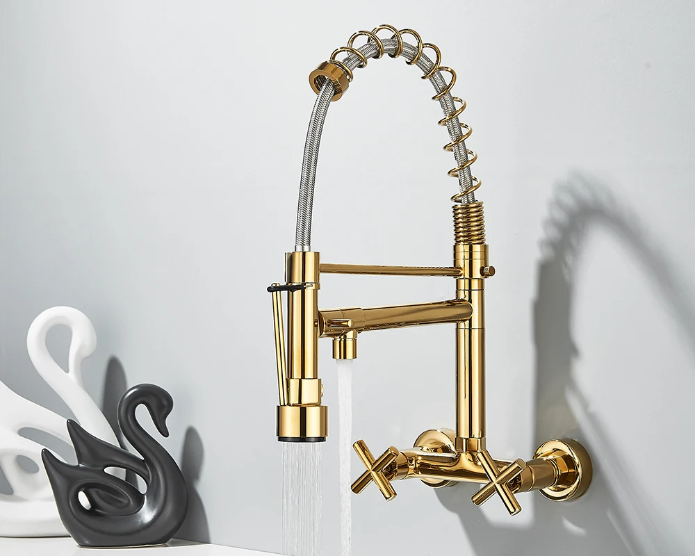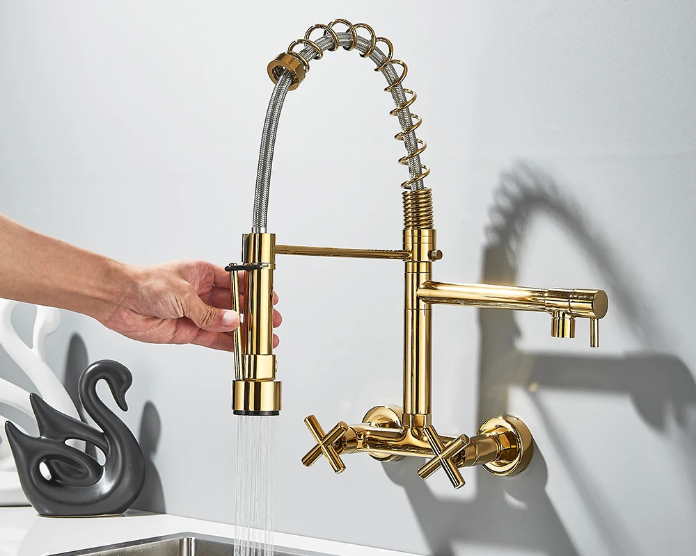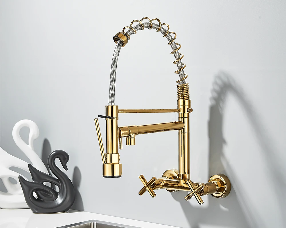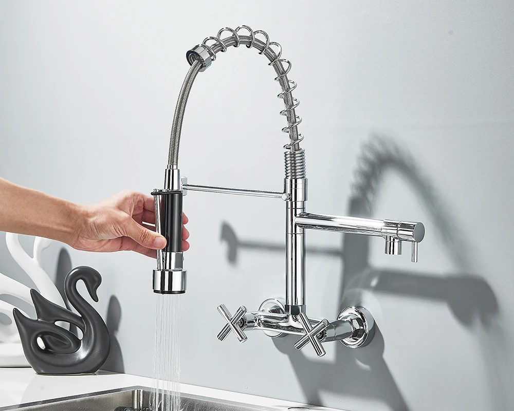 Soyez le premier à laisser votre avis sur “Robinet de cuisine mural en côtes vers le bas, eau chaude et froide, bec de printemps pour touristes, distance de 20cm pour deux trous”